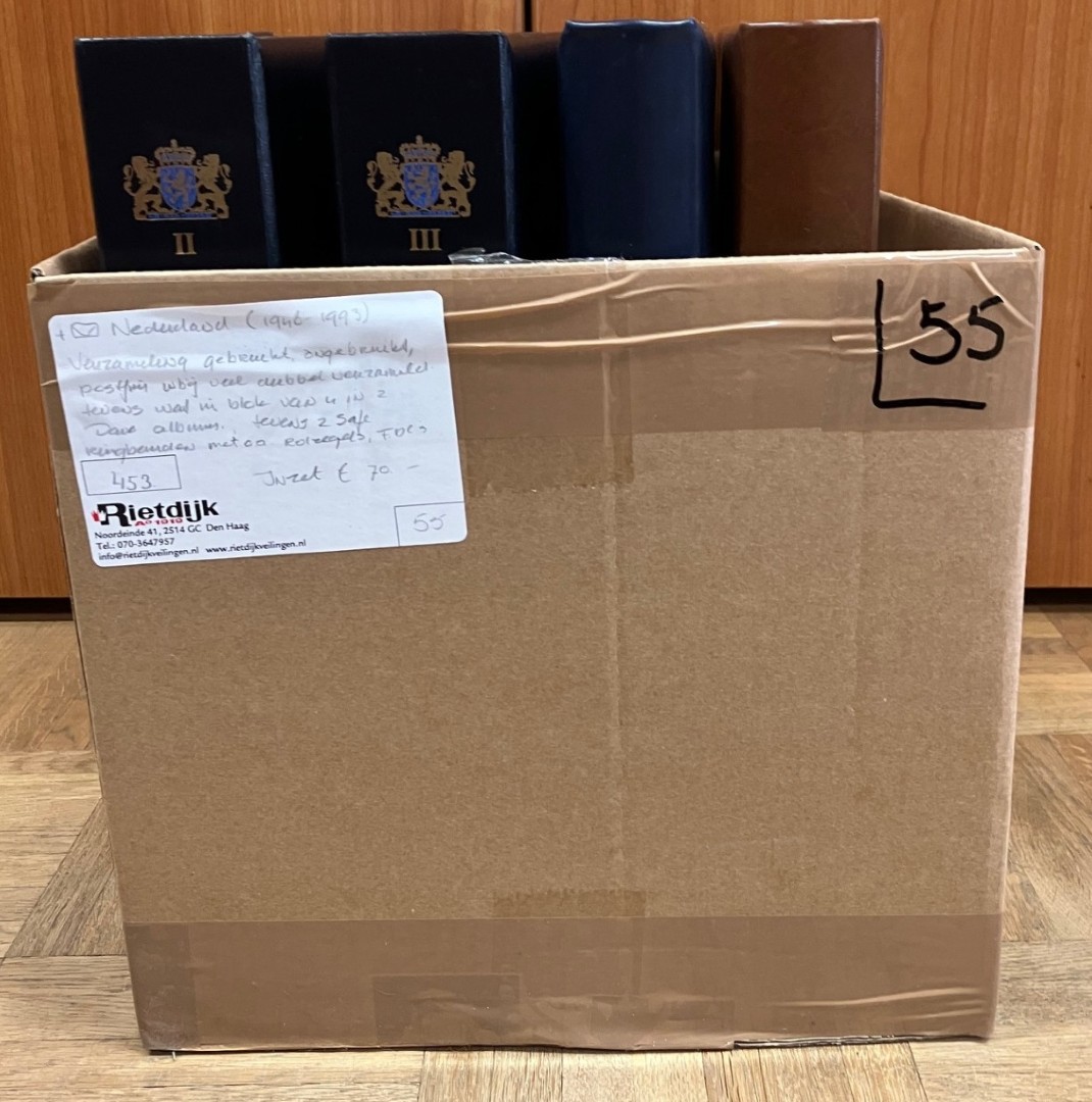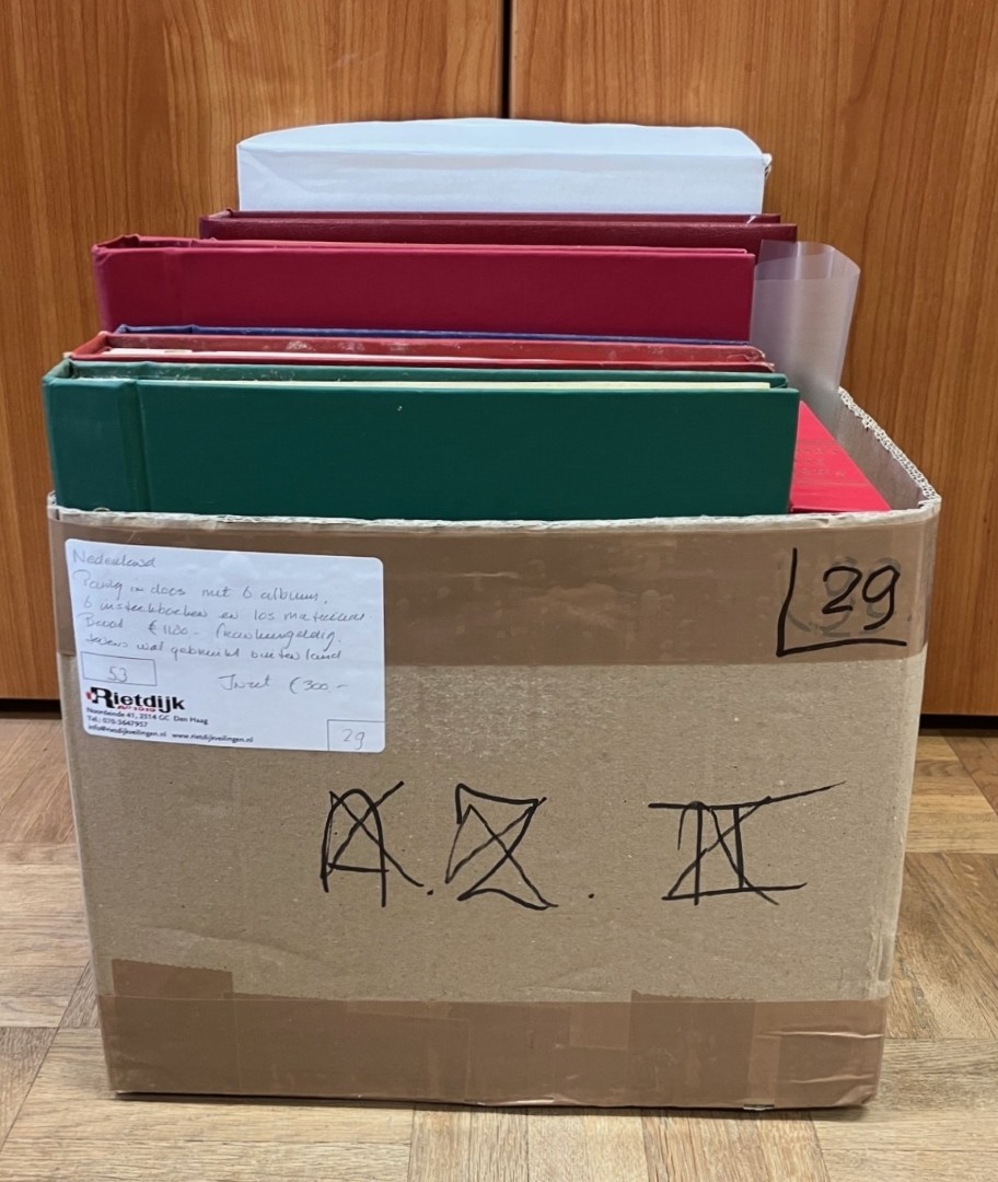 Diverse in 6 albums, 6 stockboeken en los, w.bij € 1.180,- frankeergeldig in doos. Tevens wat buitenland. Click this link for additional images and
