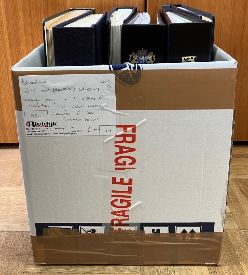 Grote hoeveelheid restanten en partijen in 14 albums, 84 stockboeken en los in 5 verhuisdozen. Bevat o.a. € 1.570,- frankeergeldig. Ook wat Overzeese Rijksdelen.