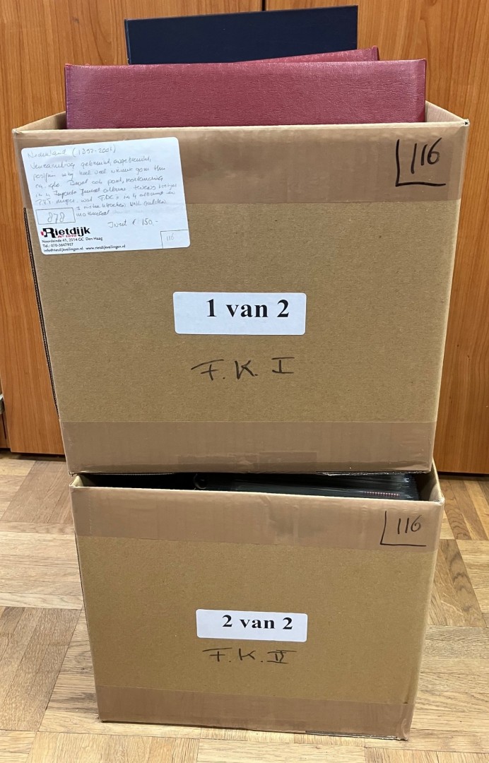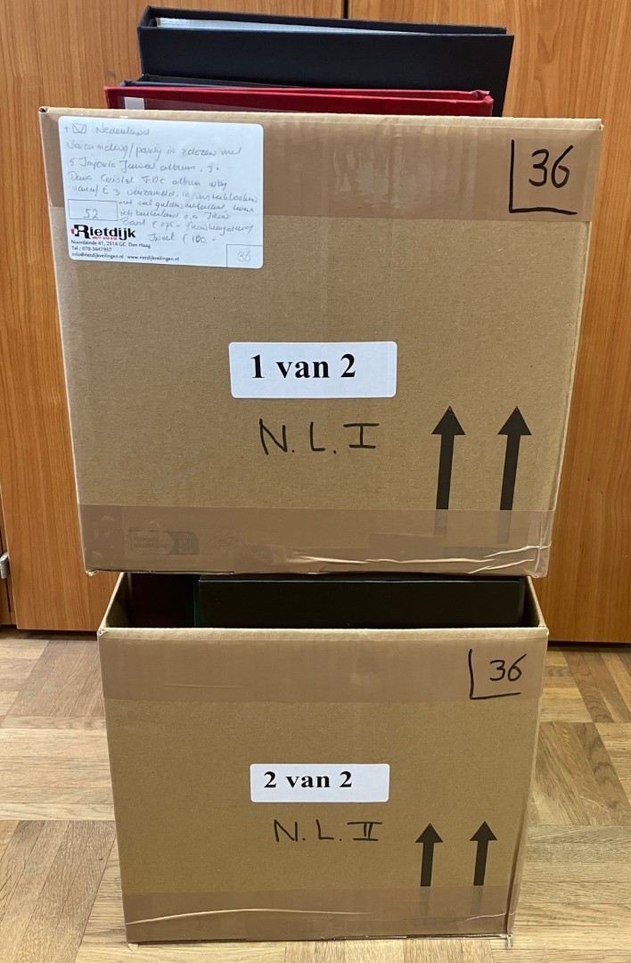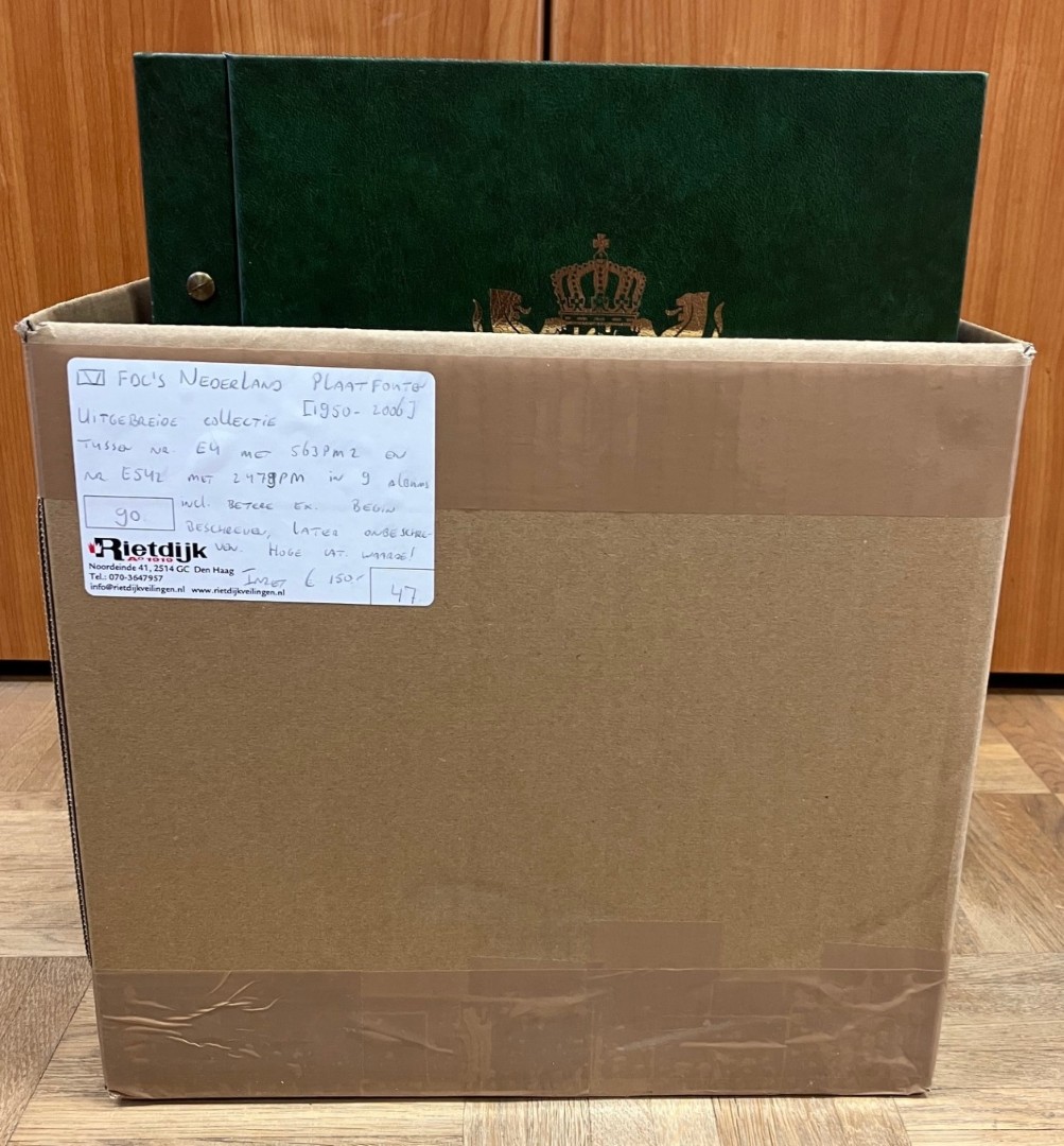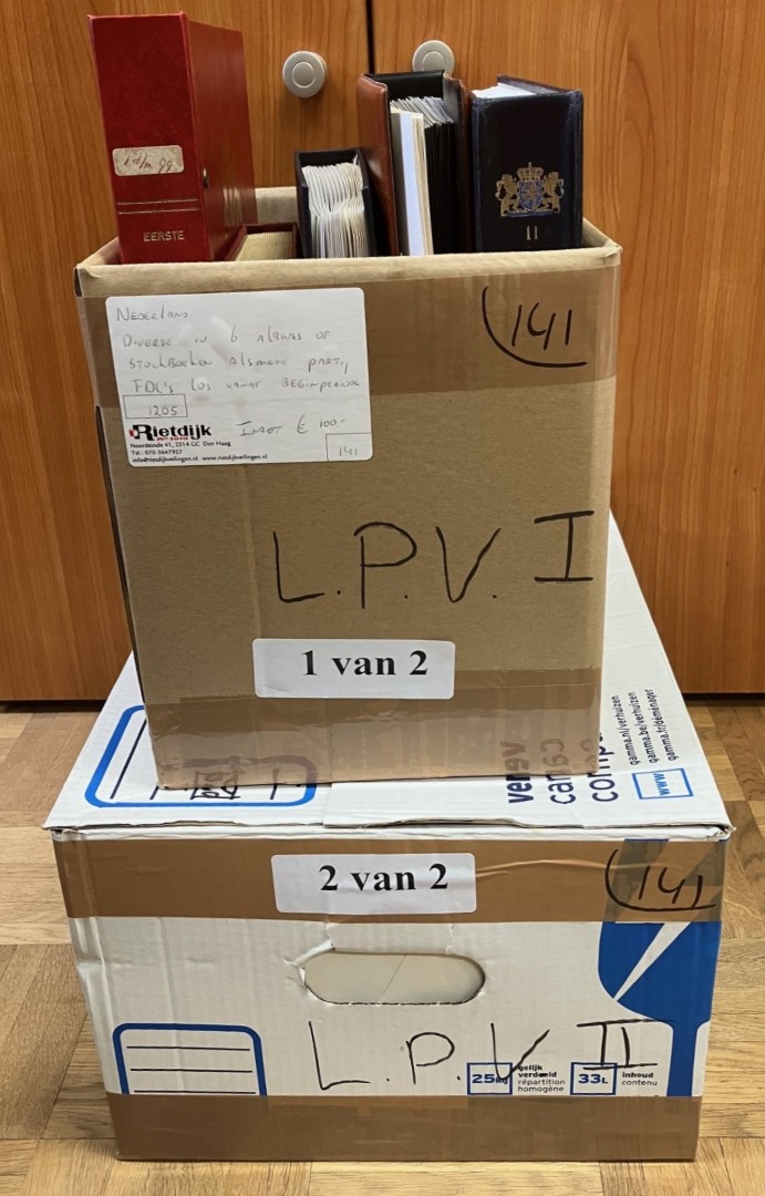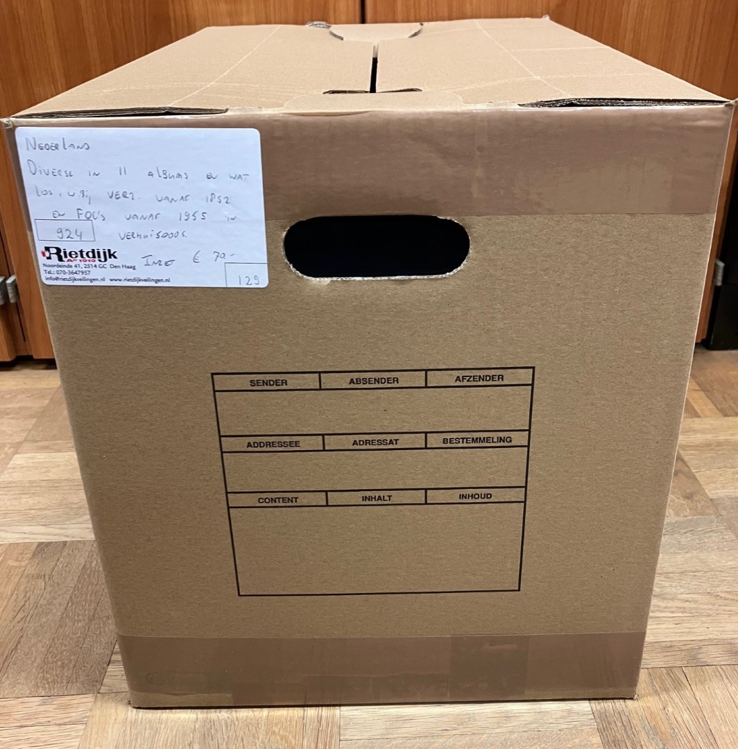 Diverse in 14 albums, 2 kleine en 1 groot stockboek en los materiaal in 2 dozen. Bevat o.a. € 310,- frankeergeldig en FDC's. Ook wat Overzeese Rijksdelen en N.V.P.H. catalogus 2025. Click this link for additional images and certificates. (Image)