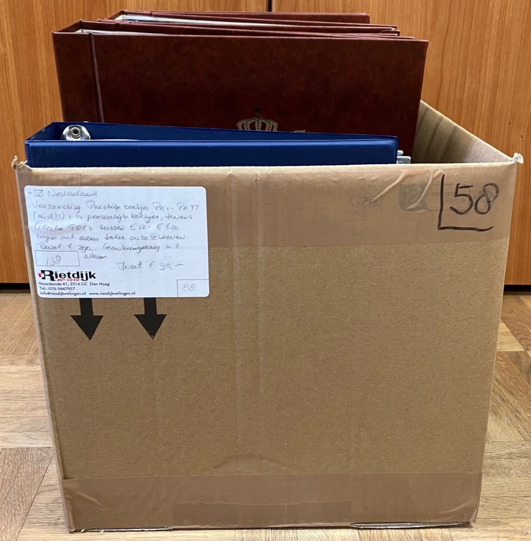 Verz. prestigeboekjes nr. PR1 t/m PR37 (excl. nr. PR11) alsmede 14 gelegenheidsboekjes in 2 albums. Tevens 6 albums FDC's tussen nr. E12 en E620. Begin beschreven en later onbeschreven. Bevat € 290,- frankeergeldig. Click this link for additional images and certificates. (Image)