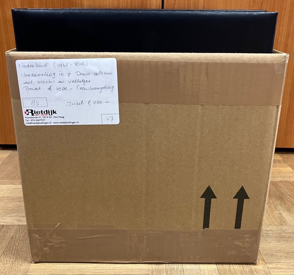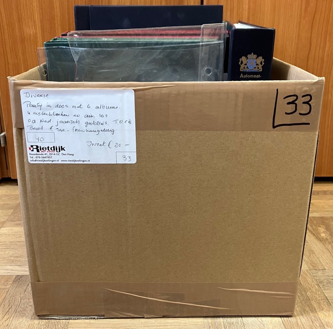 Diverse in 10 albums of stockboeken en los, w.bij o.a. € 340,- frankeergeldig, jaarsets en FDC's in doos. Click this link for additional images and