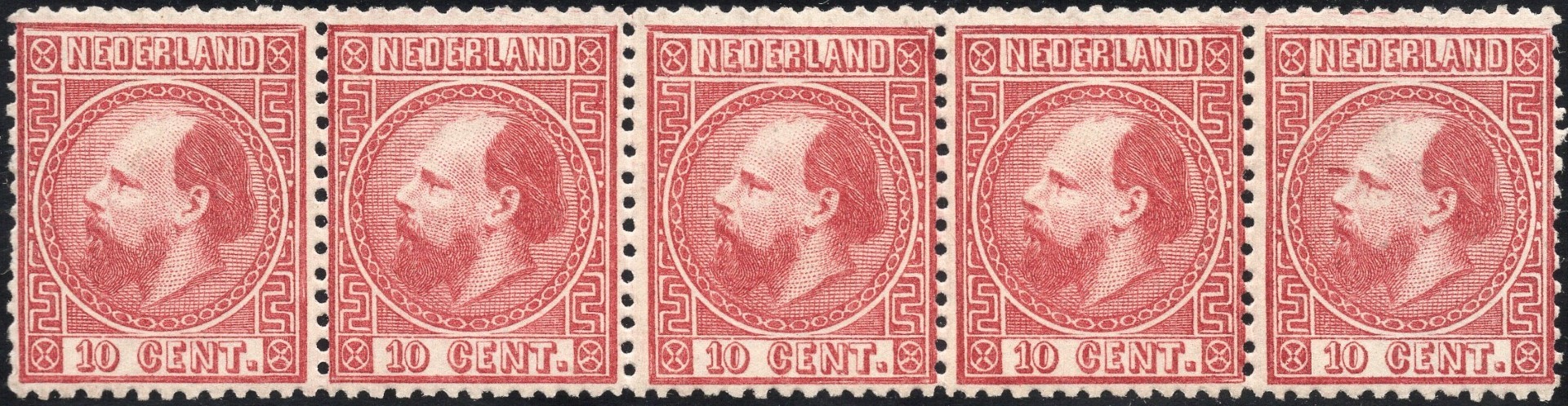 8IIC (KAMTANDING 13½ KLEINE GATEN, TYPE II) IN POSTFRISSE HORIZONTALE STRIP VAN 5 (TUSSEN 2E EN 3E ZEGEL OVER TANDING GEVOUWEN GEWEEST). MET FOTOCERTIFICAAT (1997). UITERMATE ZELDZAAM! Click this link for additional images and certificates. (Image)