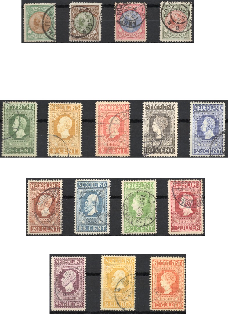 [1893-1913]. Hangend Haar nr. 45-48 en Jubileum nr. 90 t/m 101 gebruikt op insteekkaart, w.bij nr. 48 en 101 met fotocertificaat Ned. Bond (2021). Click this link for