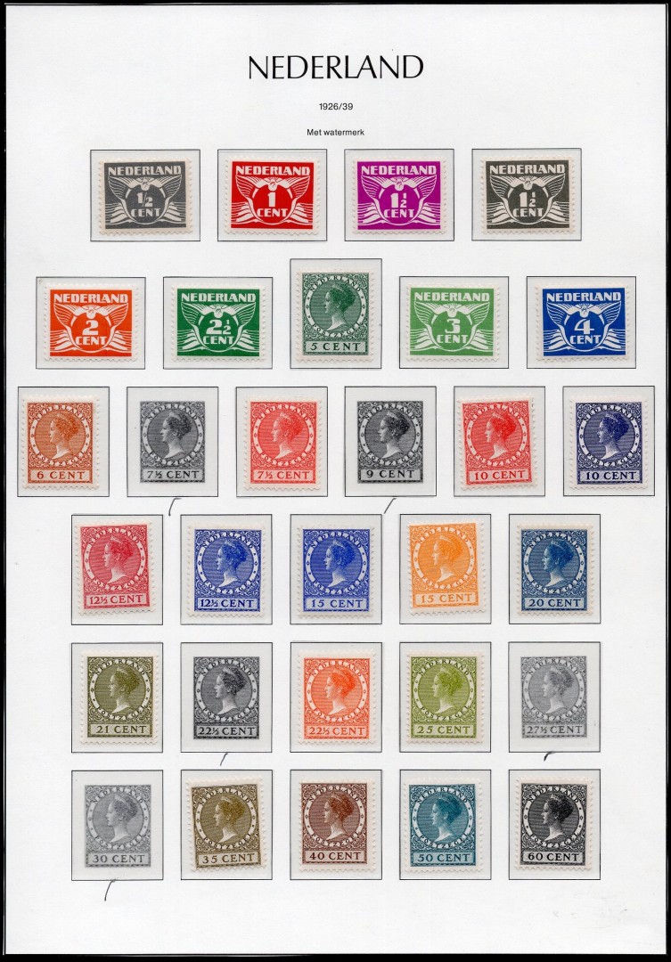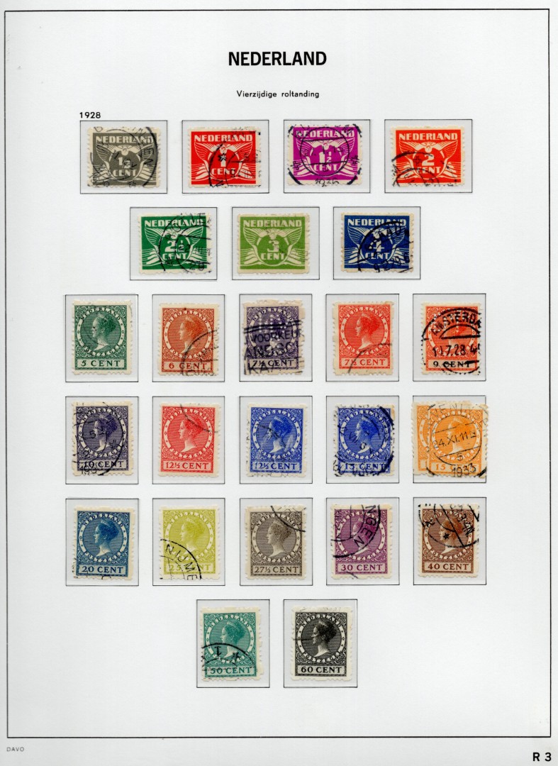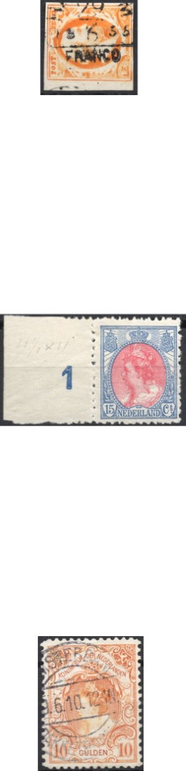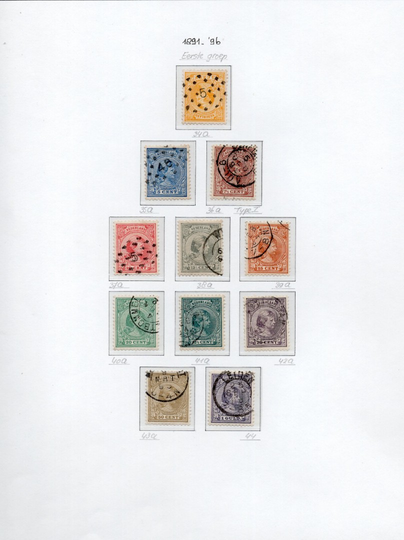 Gebruikte verz. Hangend Haar nr. 34 t/m 48 opgezet per groep en tanding alsmede proef nr. Pc. 116a en 116b ongebruikt op blanco bladen. Click this link for additional