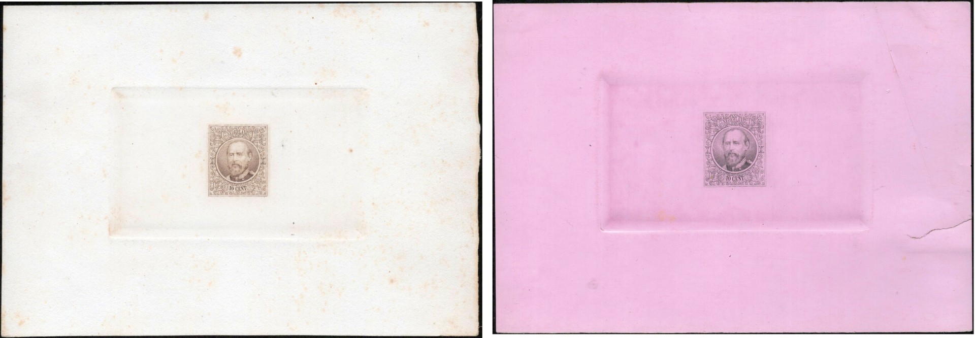Proeven [1869]. Proef Delpierre 10 cent Pc. nr. 79c (licht-sepia op wit kartonpapier) alsmede Pc. nr. 79m (zwart op lichtrose geglaceerd kartonpapier) doch diagonale vouw en scheur aan rechterzijde. Click this link for additional images and certificates. (Image)