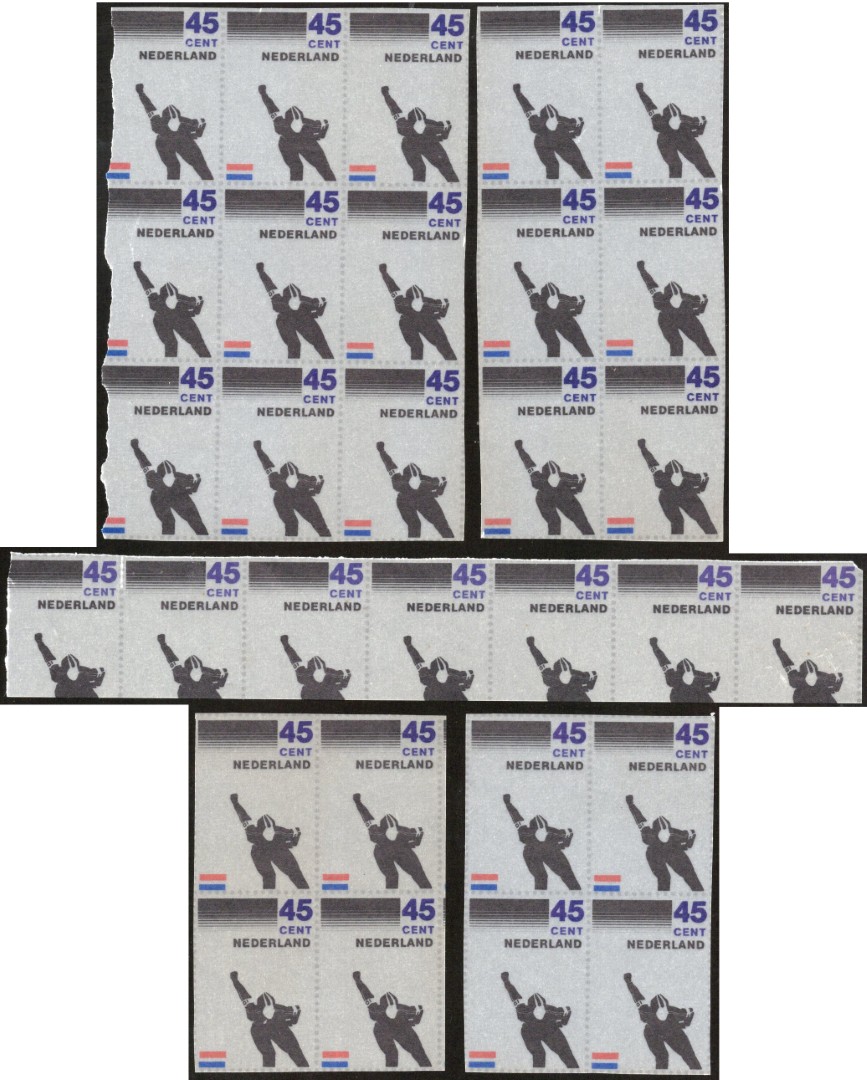 [1982]. 100 Jaar KNSB nr. 1261, proefdruk op mat halfdoorzichtig papier in blokken van 4 (2x), blokken van 6 (2x) en aangesneden strip van 7. Op verzoek van de ontwerper is deze proefdruk gemaakt. Schaars! (Image)
