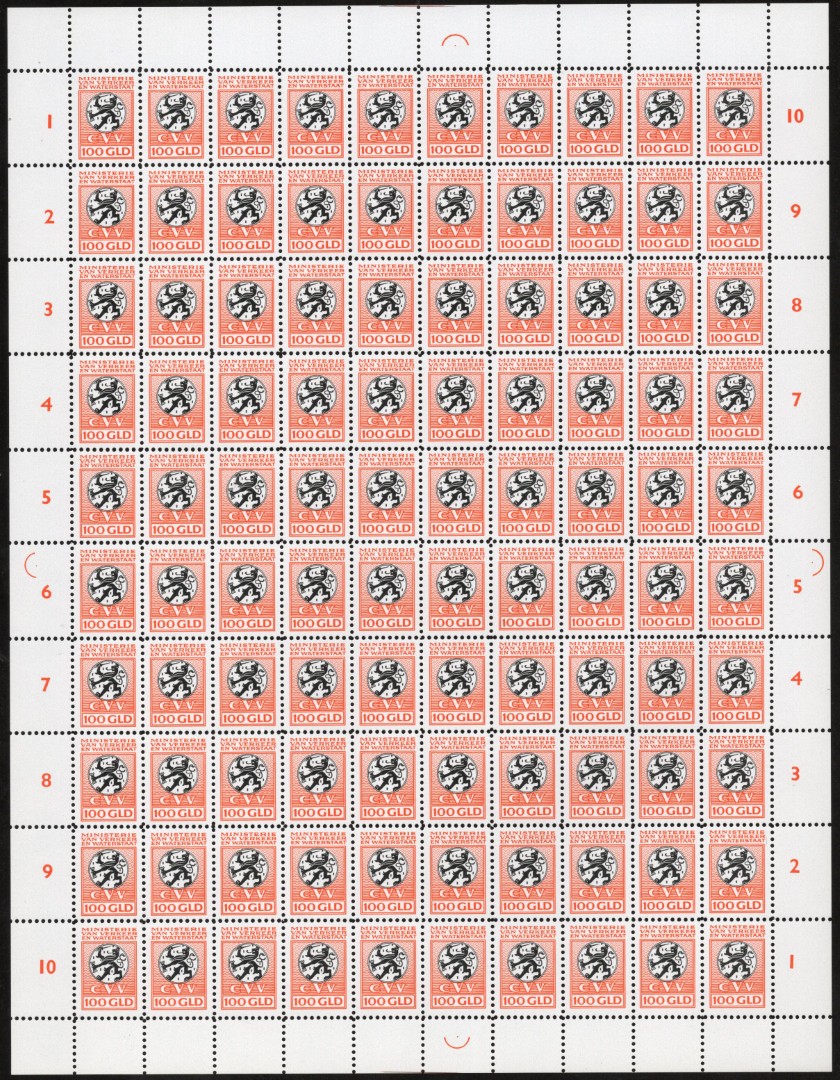 (Fiscaal). Belastingzegels CVV (Commissie Vervoers Vergunningen) uitgave Ministerie van Verkeer en Waterstaat tbv chauffeursvergunningen in postfrisse complete vellen van 100 (75 cent, 1, 2, 2½, 5, 10, 20 en 100 Gulden). Click this link for additional images and certificates. (Image)