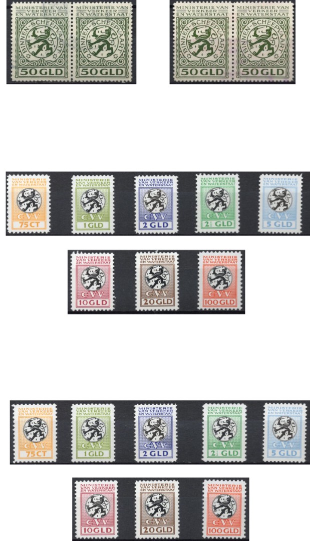 (Fiscaal). Belastingzegels uitgave Ministerie van Verkeer en Waterstaat met Binnen-Scheepvaart 50 Gulden (4x) gebruikt en C.V.V. 75 cent, 1, 2, 2½, 5, 10, 20 en 100 Gulden (2x) postfris. (Image)