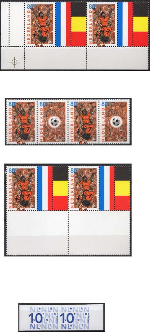 Voetbal nr. 1888 in paren met er tussen de Nederlandse en Belgische vlag en nr. 1888-1889 beide 2x tezamen in strip van 4. Afkomstig van complete vellen die waren bedoeld voor het vervaardigen van inhouden voor postzegelmapjes. Toegevoegd 10 cent
