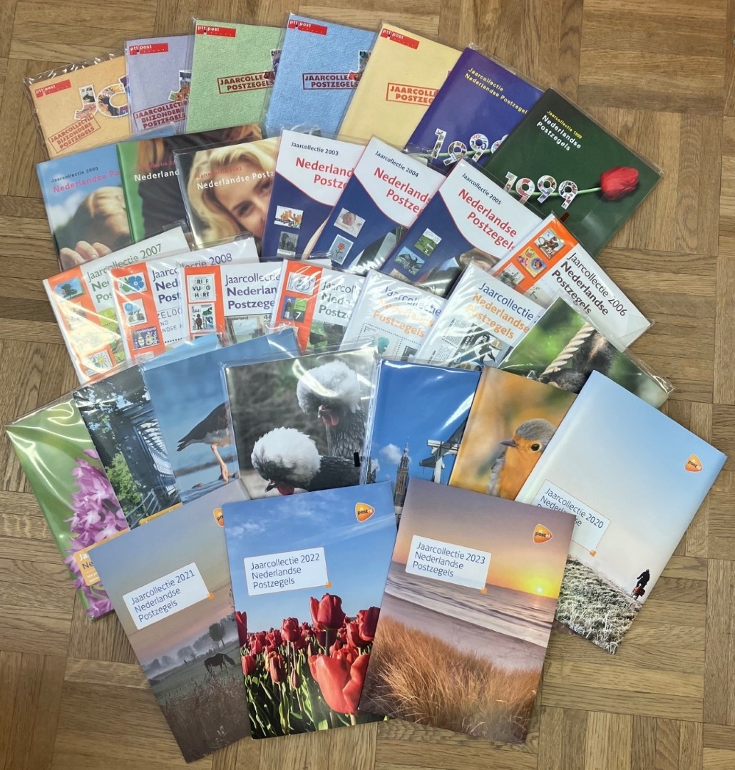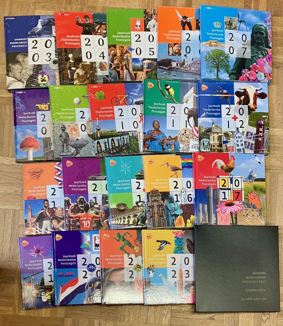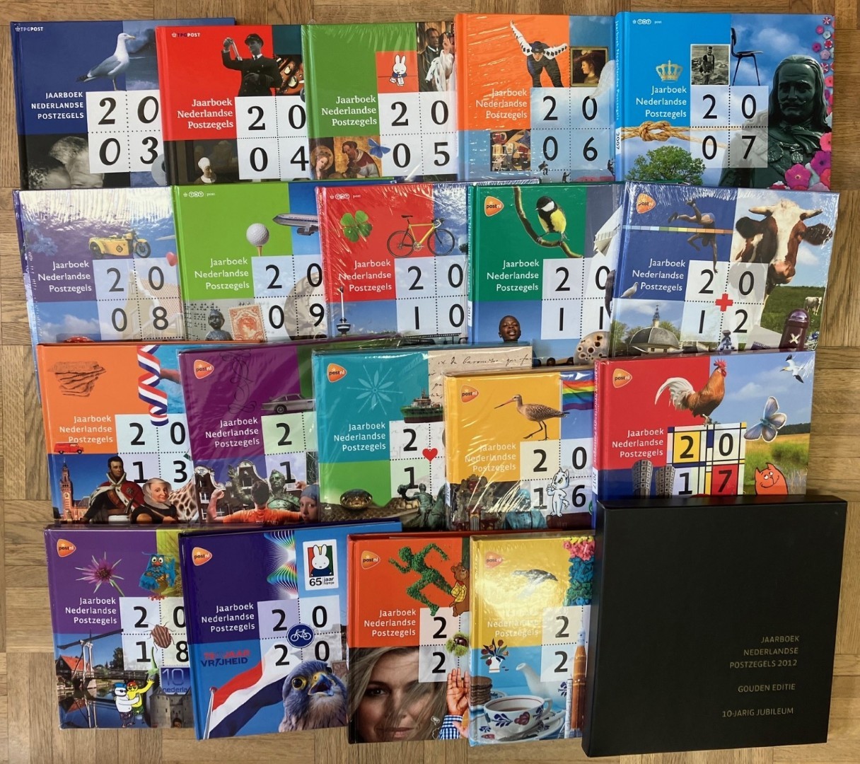 DOOS MET LUXE JAARBOEKEN 2003 T/M 2018, 2020, 2021 EN 2023 POSTFRIS ALSMEDE GOUDEN EDITIE 2012 (GESTEMPELD). FRANKEERWAARDE € 2170,-. Click this link for additional