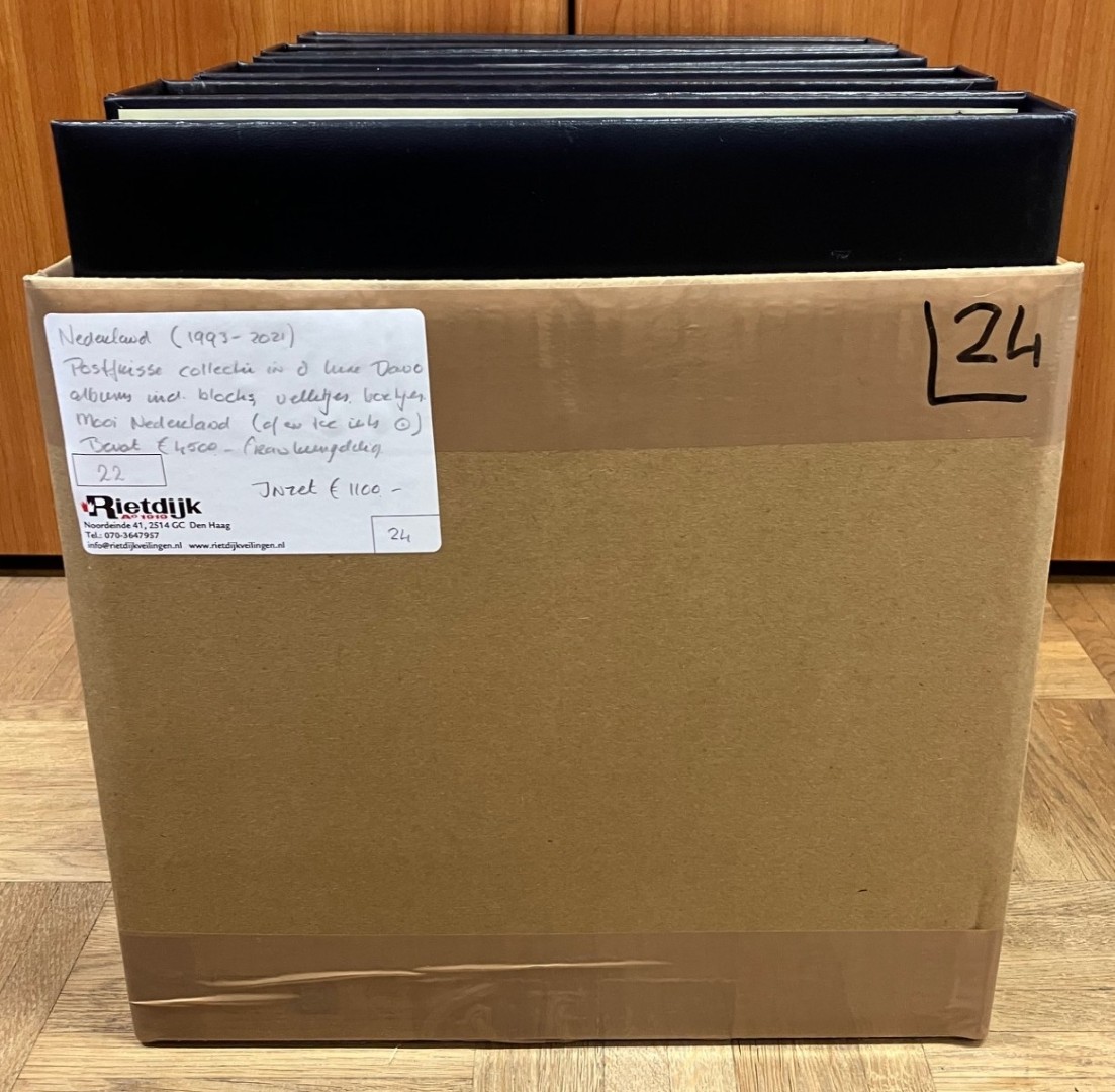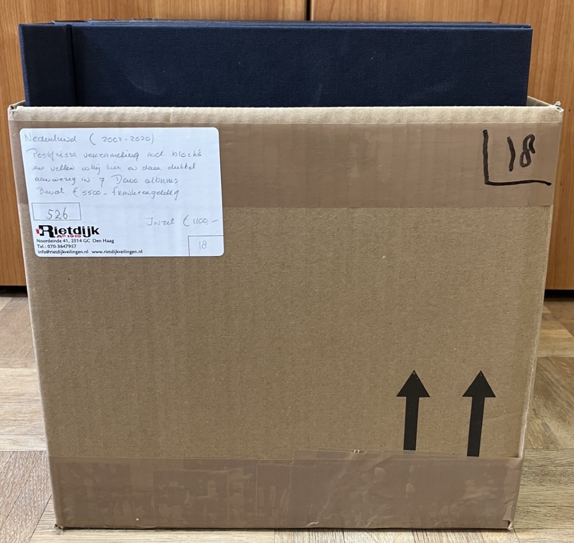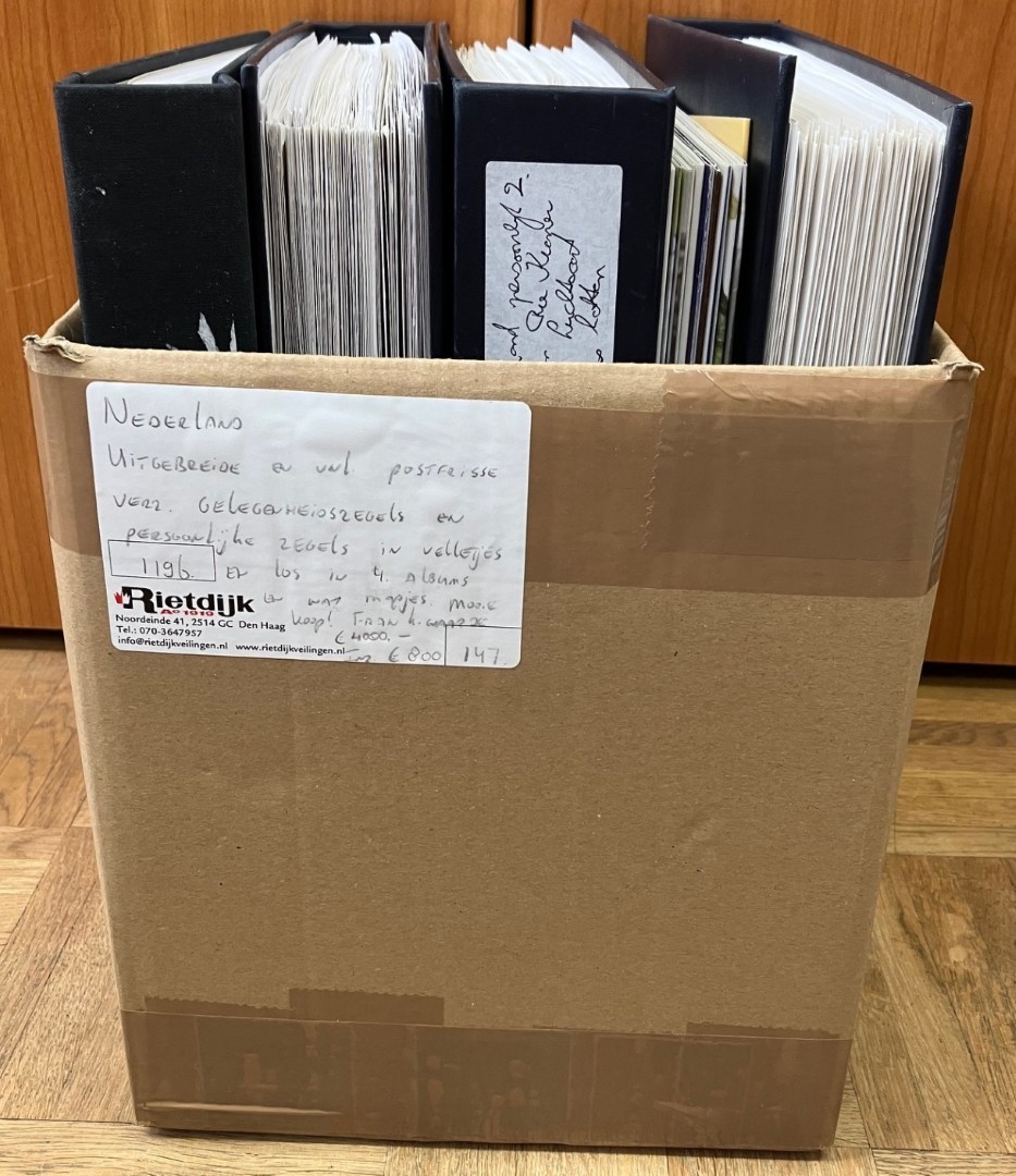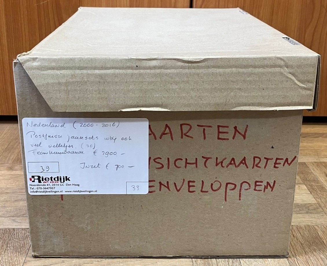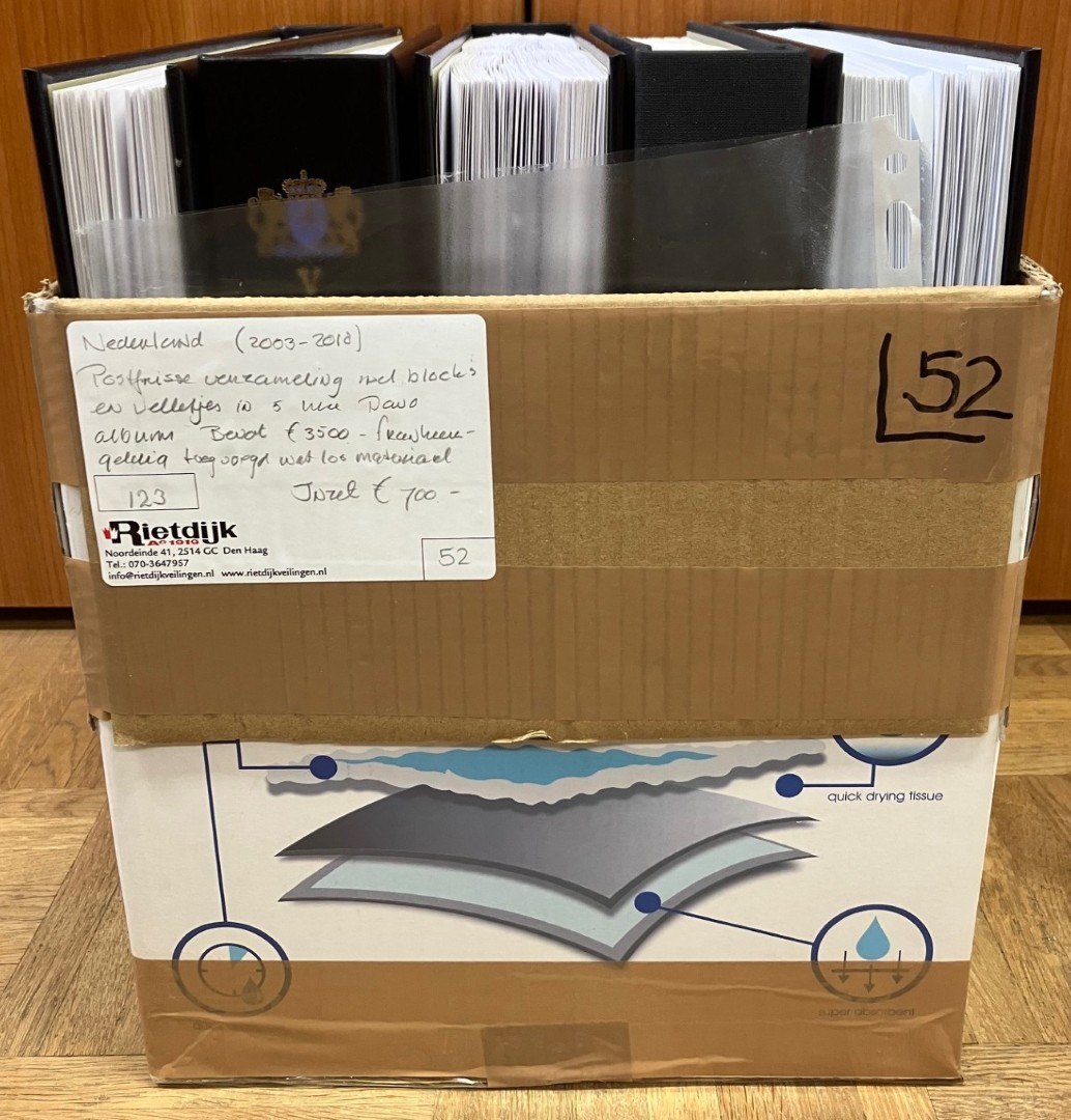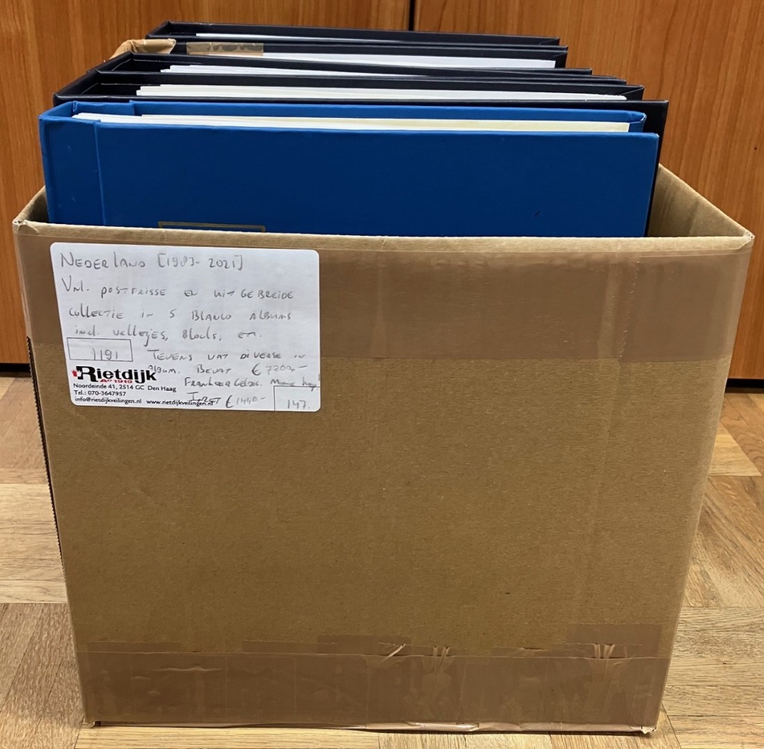 Doos met o.a. verz. Mooi Nederland t/m 2012, Bloemenpracht en prestigeboekjes tussen nr. PR1 en PR37 in 4 albums. Frankeerwaarde € 750,-. Click this link for additional
