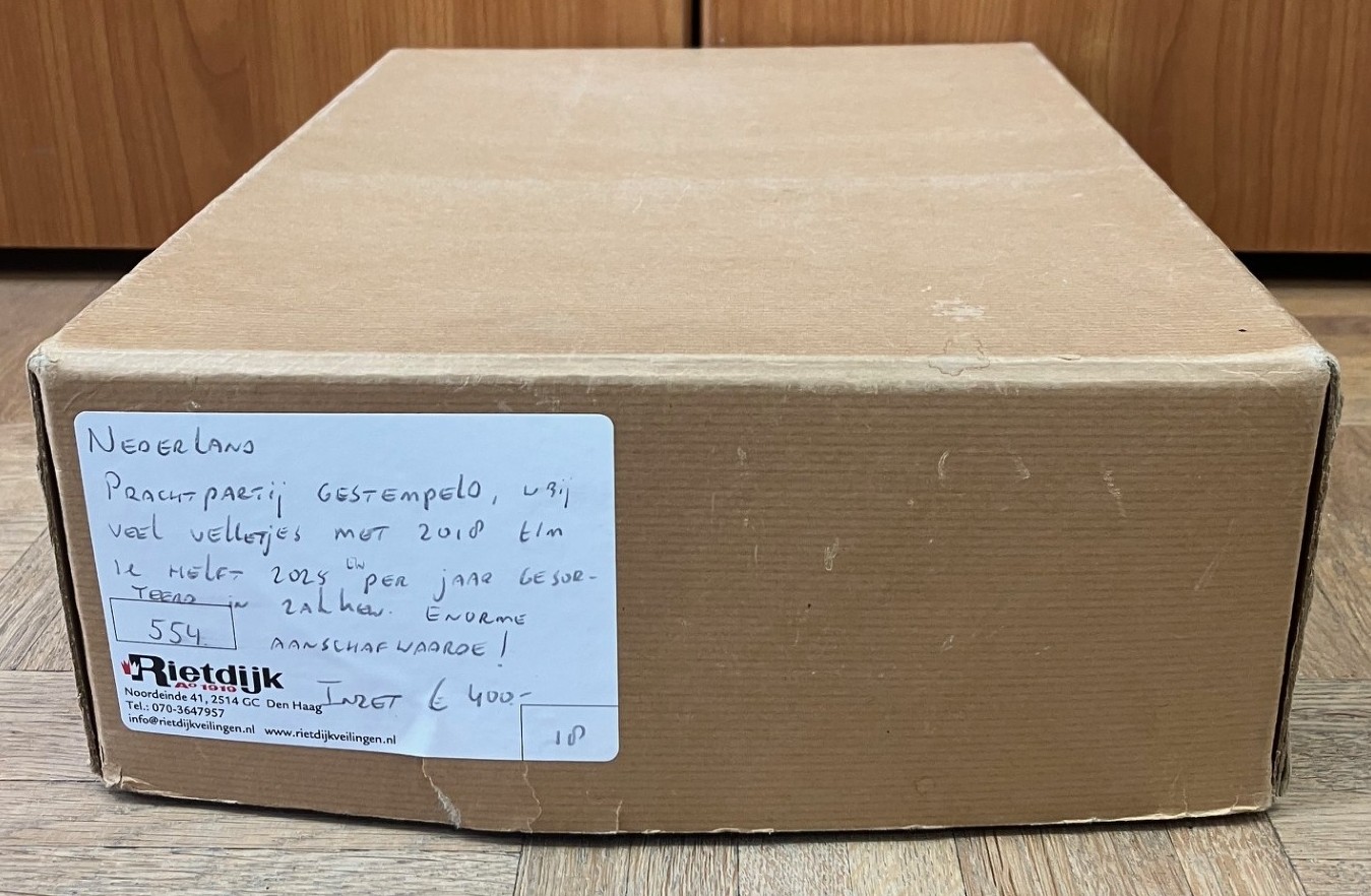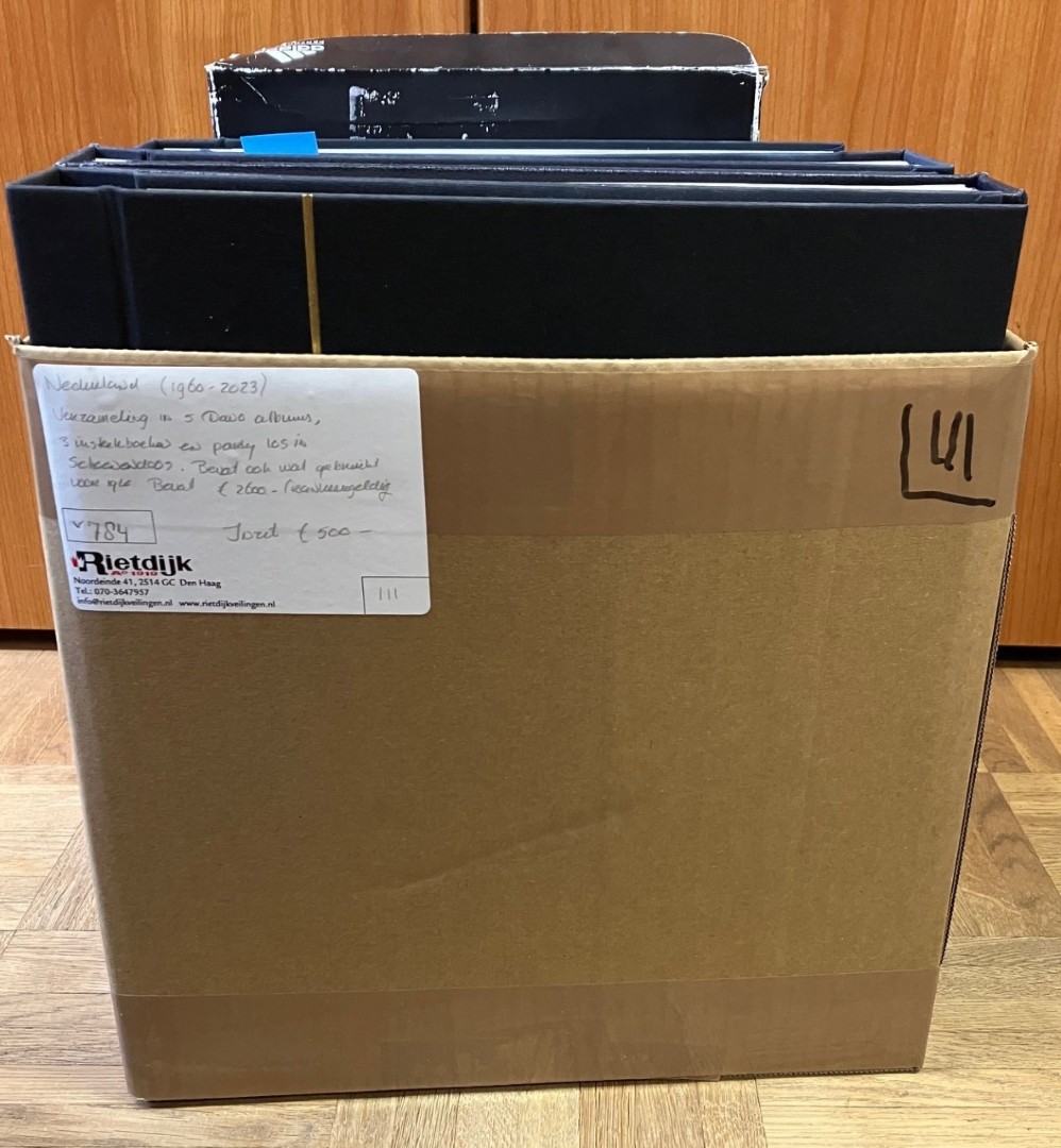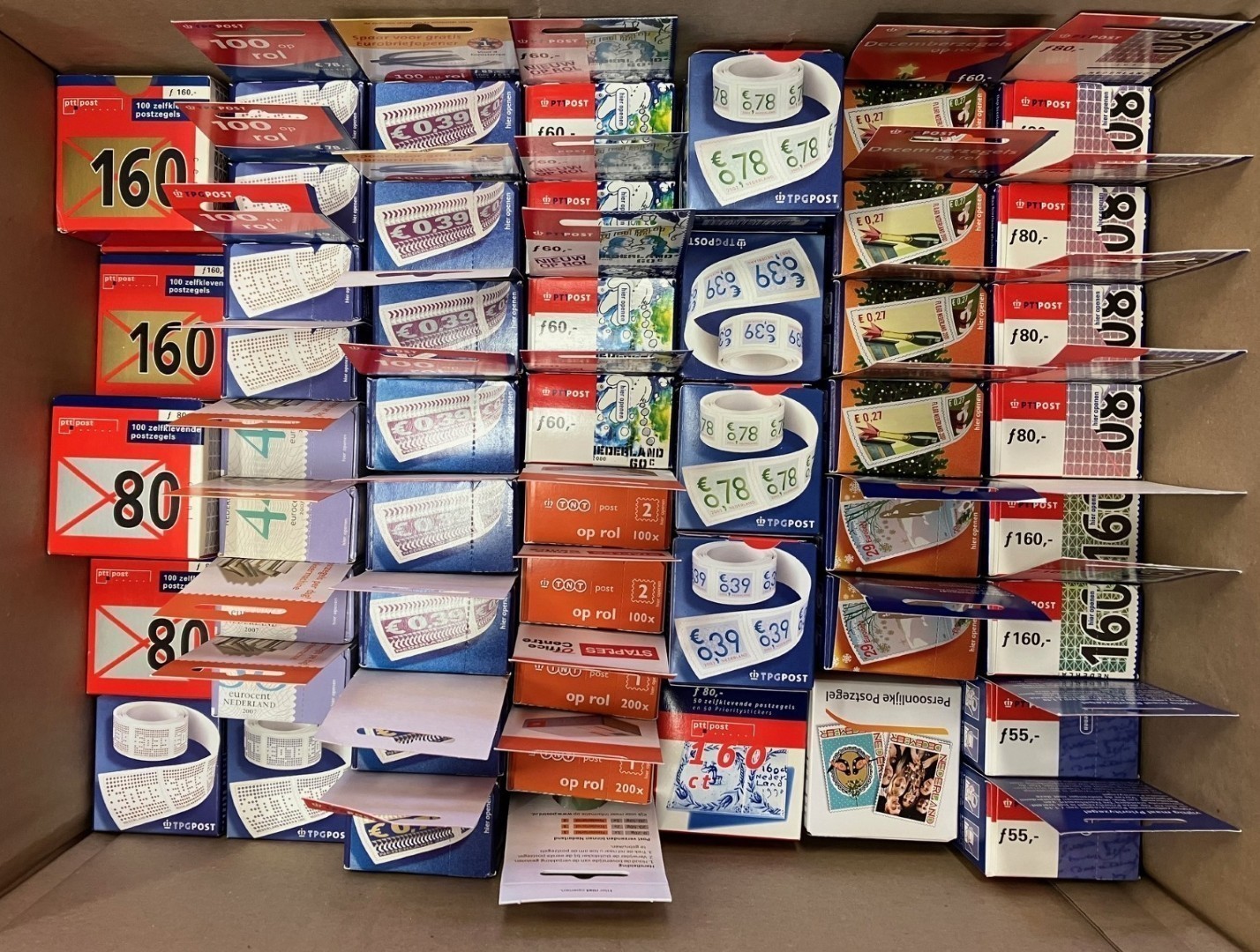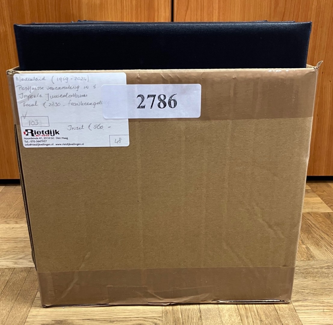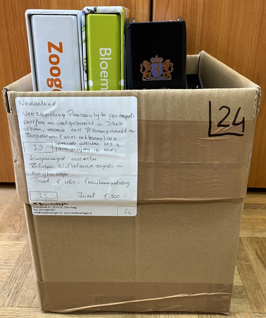 Doos met o.a. verz. Mooi Nederland t/m 2012, Bloemenpracht en prestigeboekjes tussen nr. PR1 en PR37 in 4 albums. Frankeerwaarde € 750,-. Click this link for additional