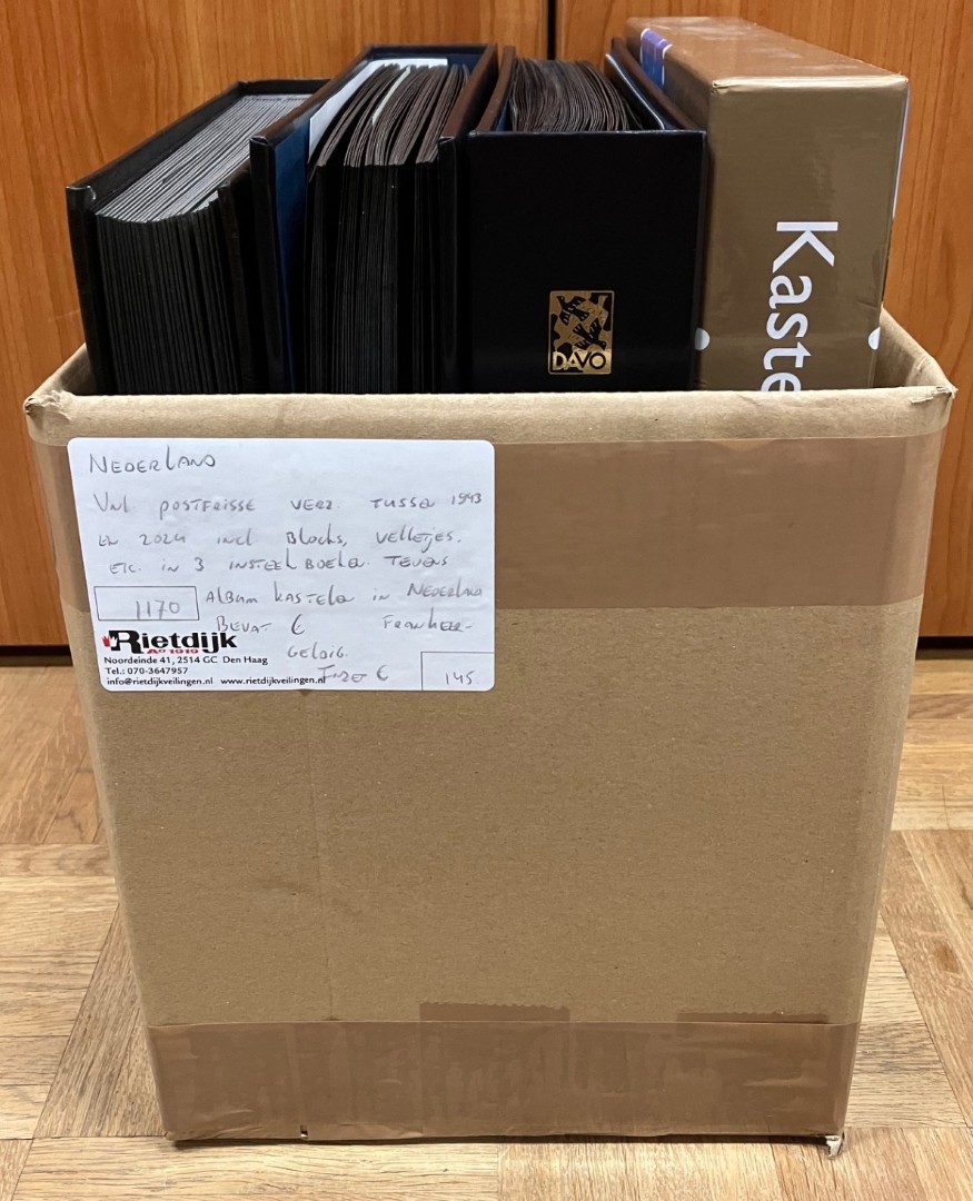 VNL. POSTFRISSE VERZ. TUSSEN 1943 EN 2024 INCL. BLOCKS, VELLETJES, ETC. IN 3 INSTEEKBOEKEN. TEVENS ALBUM KASTELEN IN NEDERLAND. BEVAT € 3300,- FRANKEERGELDIG. Click this