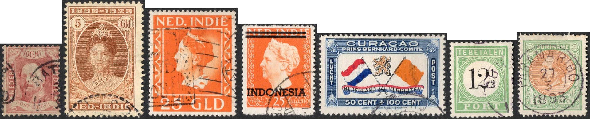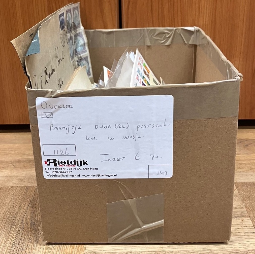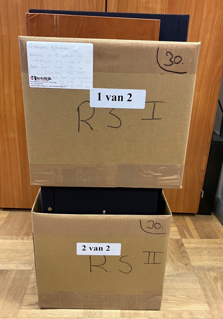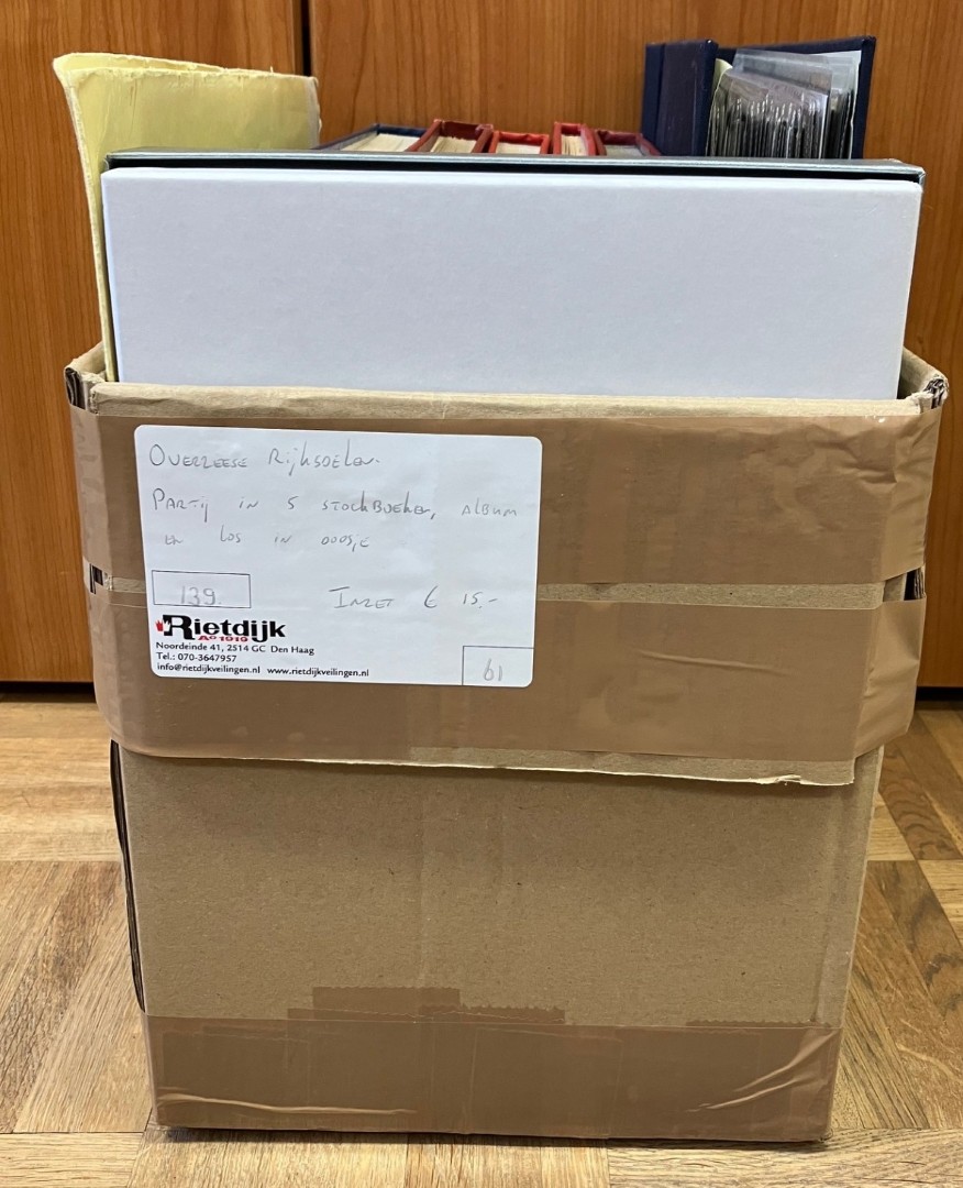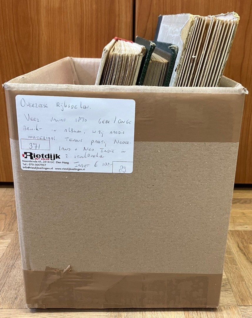 RIJKSDELEN. Vnl. gebruikte partij in 2 albums, 9 grote en 2 kleinere stockboeken en in 3 schoenendozen met zakjes in bananendoos. Bevat o.a. veel Indonesië. Click this