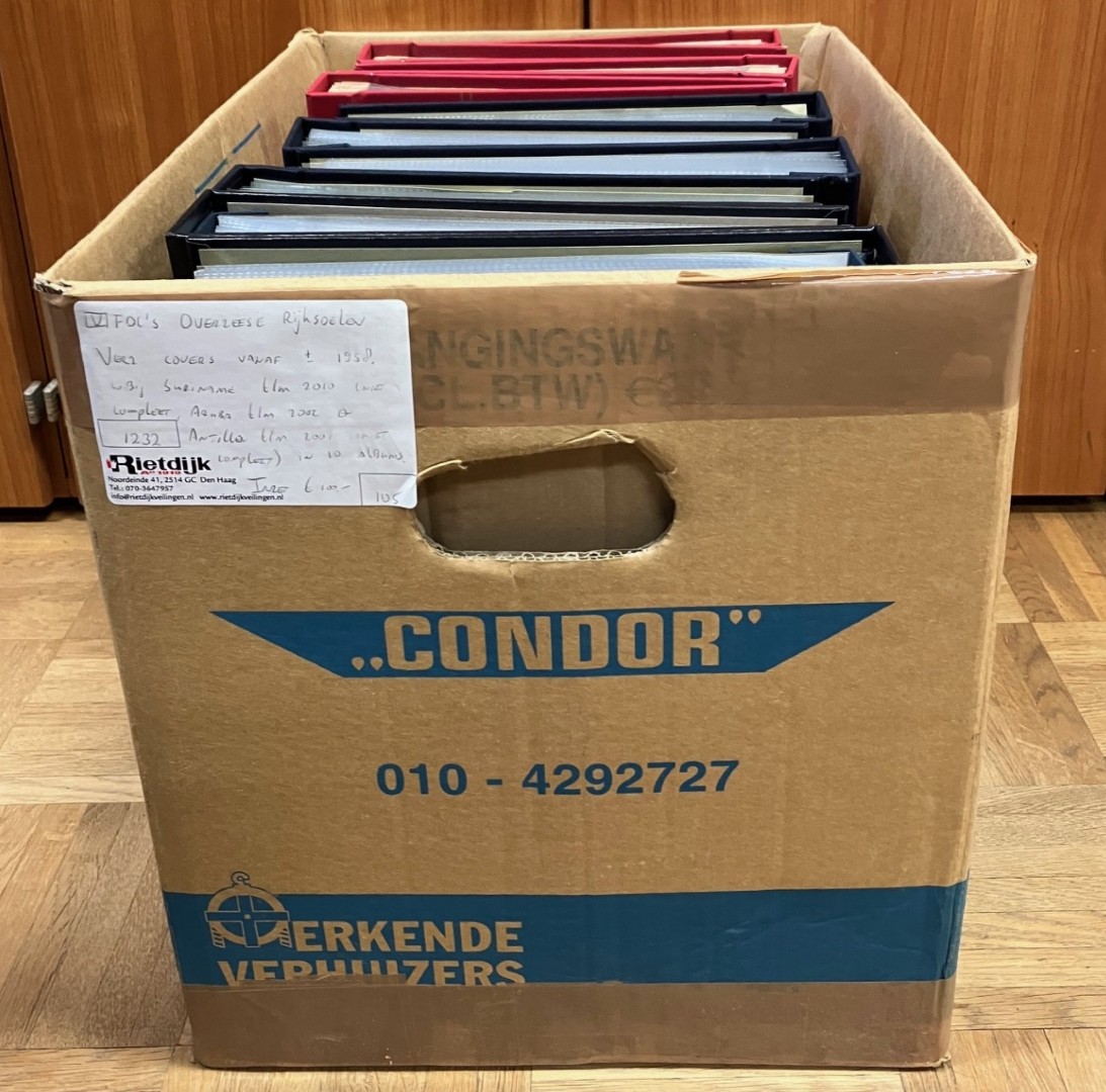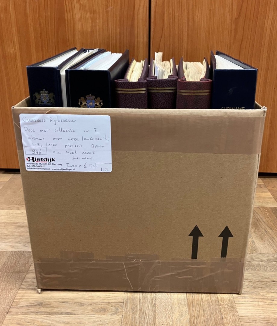 RIJKSDELEN. Doos met collectie in 7 albums met gebr./ongebruikt, w.bij later postfris. Bevat o.a. heel aardig Suriname. Click this link for additional images and
