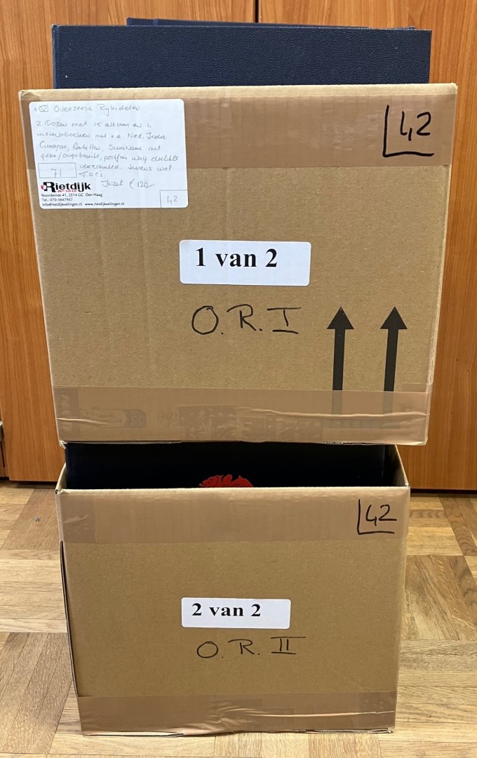 RIJKSDELEN. Diverse restantcollecties in 15 albums en 4 stockboeken met Ned. Indië, Curaçao/Antillen, Aruba en Suriname met gebr./ongebruikt en later ook postfris in 2 dozen. Bevat ook wat FDC's. Click this link for additional images and certificates. (Image)