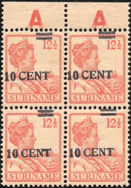Hulpuitgifte nr. 112 in randblok van 4 met sterk verschoven zwarte overdruk. Gom ingedroogd. (Image)