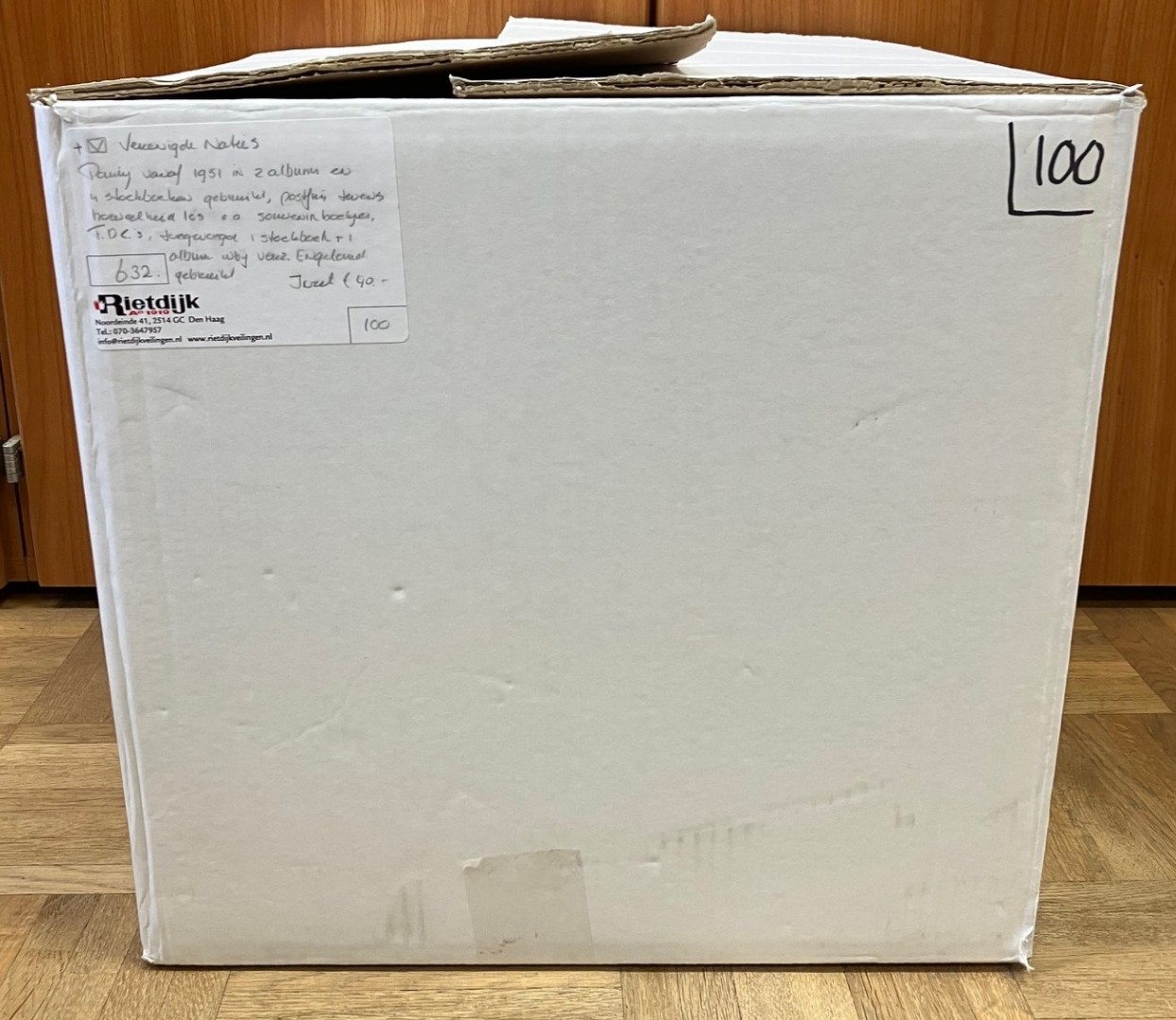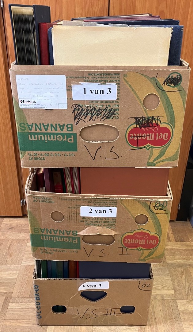 1531 imageWERELD. Grote hoeveelheid restanten vnl. gebruikt eenvoudig materiaal in 82 vnl. grote of kleinere stockboeken in 3 bananendozen.