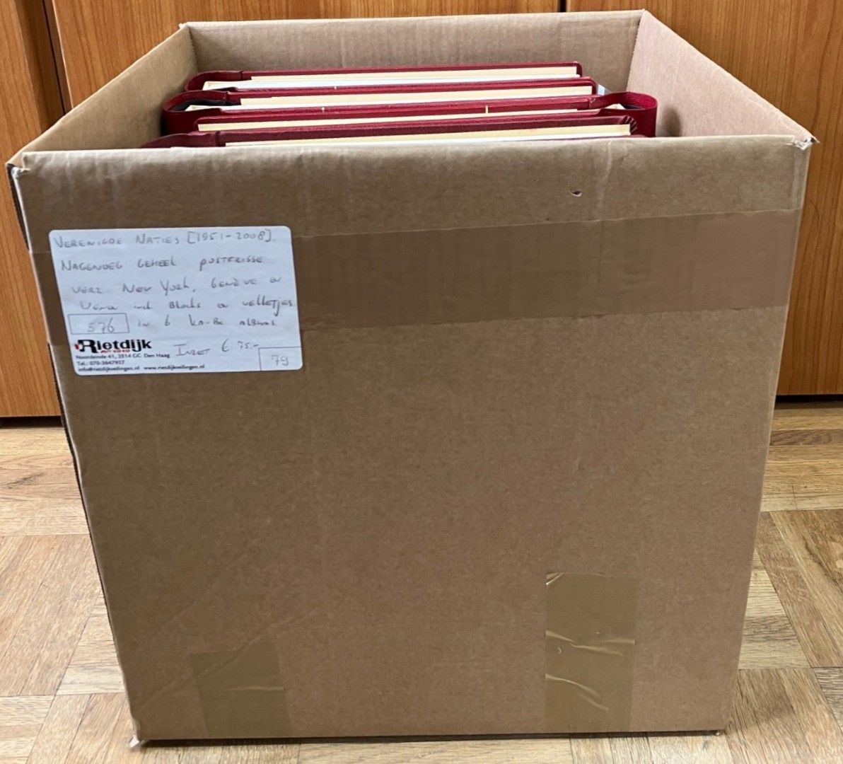 1529 imageVERENIGDE NATIES [1951-2004]. Zeer uitgebreide collectie met FDC's, postwaardestukken, maximumkaarten, souvenir cards en folders, etc. in 46 albums. Bevat ook blokken van 4, vlaggenvellen op grootformaat cover, etc. Mooie koop!