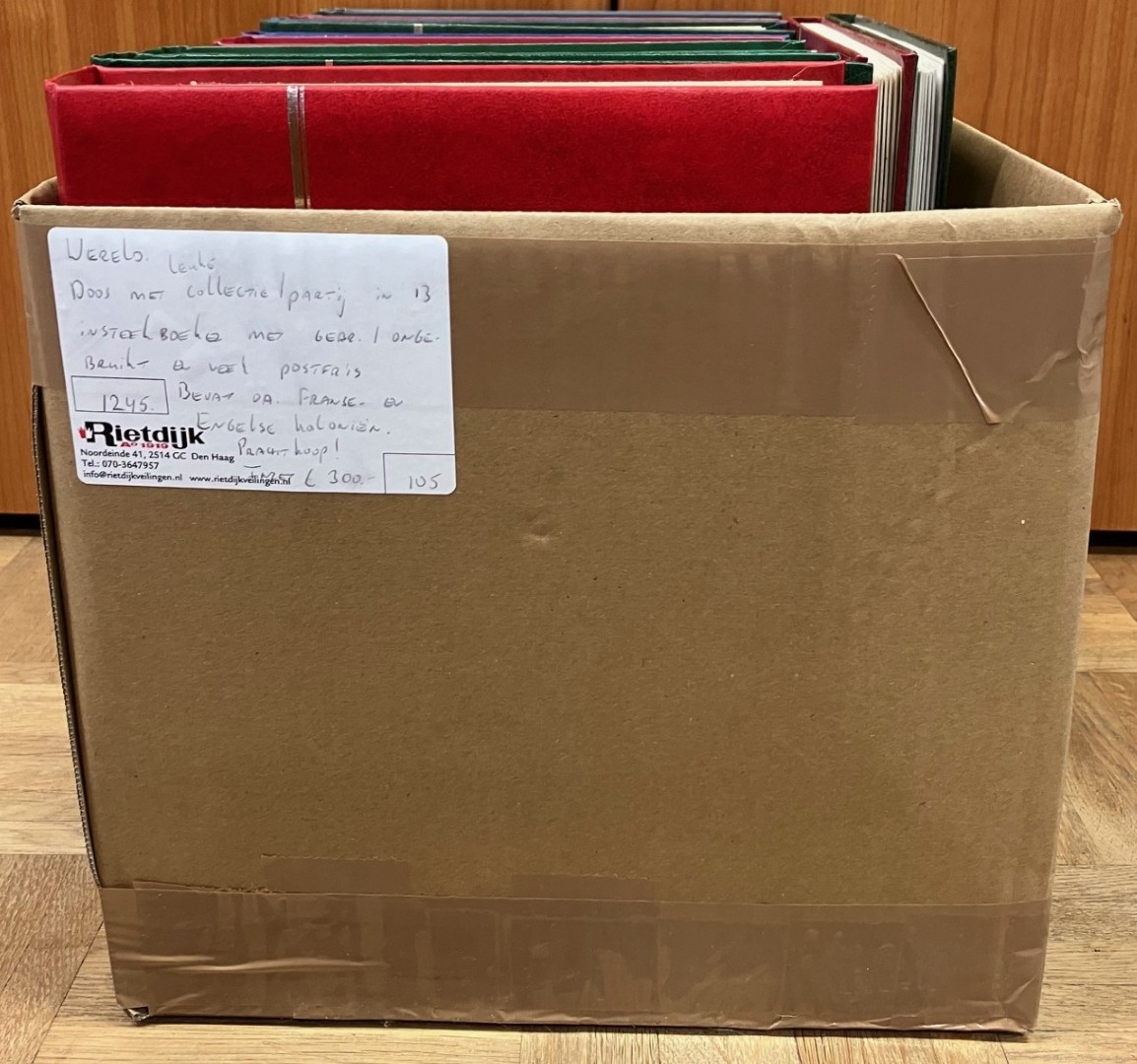 Doos met leuke collectie/partij in 13 insteekboeken met gebr./ongebruikt en veel postfris materiaal. Bevat o.a. Franse- en Engelse Koloniën alsmede motief. Prachtkoop! Click this link for additional images and certificates. (Image)