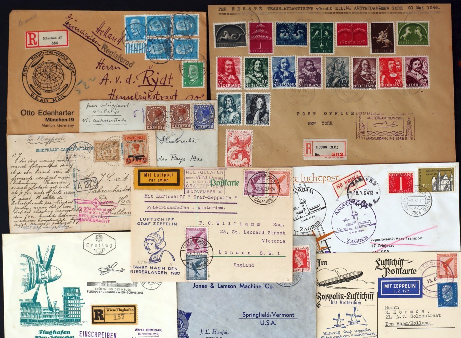 LANDEN. Partijtje luchtpoststukken incl. wat zeppelins, w.bij Nederland en O.R. in map. Click this link for additional images and certificates. (Image)