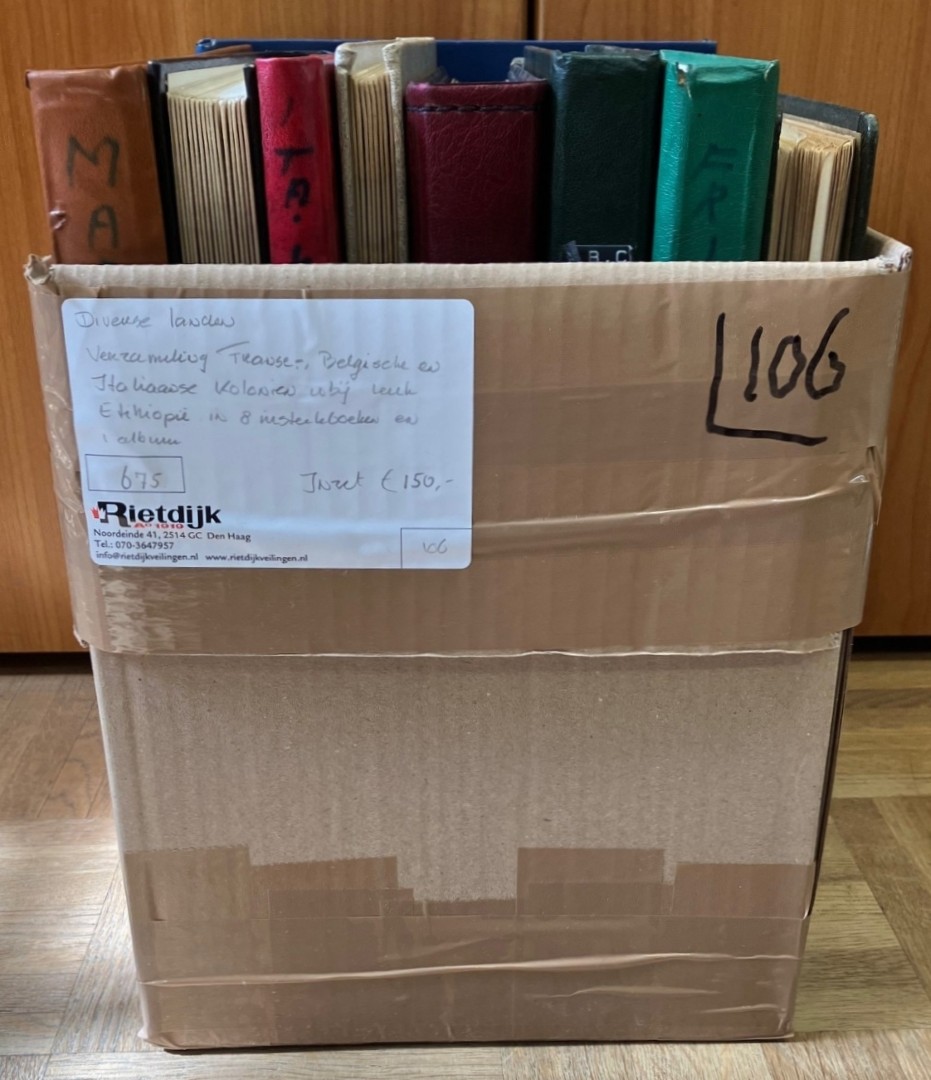 LANDEN. Doos met o.a. Franse-, Italiaanse- en Belgische Koloniën vanaf oud alsmede verz. Ethiopië in 8 stockboeken en klemband. Leuke koop! Click this link for additional