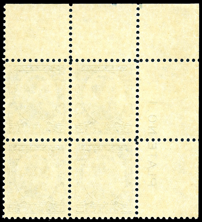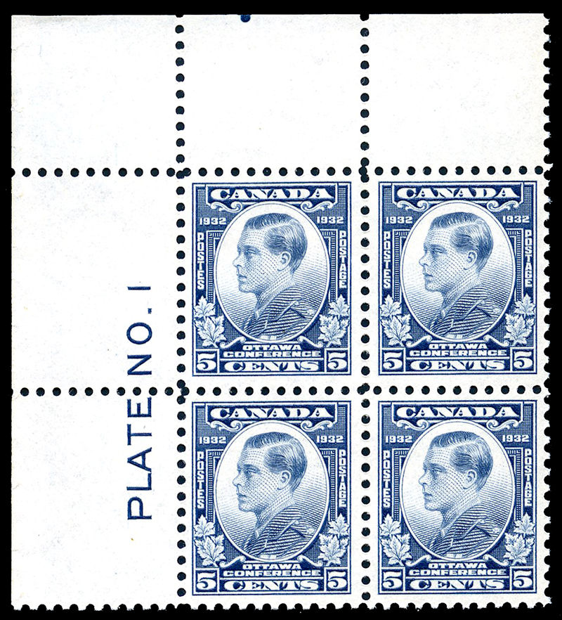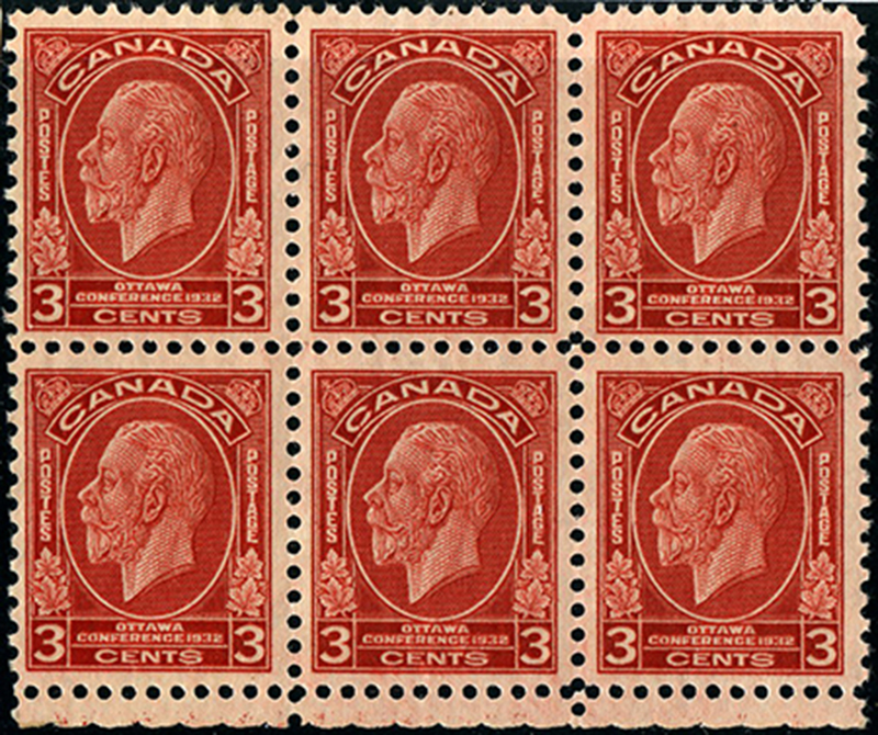 192,i: 3¢ deep red Ottawa Conference, bottom margin block of six, the top middle stamp with BROKEN E variety, nh and fine (Image)