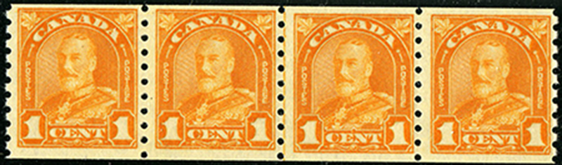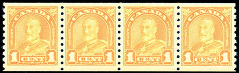 1¢ Arch orange coil strip of 4, nh, very fine. (Image)