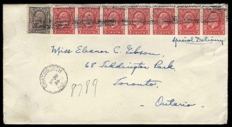 196,197: 2¢ and 3¢ strip of 7 Medallion issue tied by roller to 23¢ rate SPECIAL DELIVERY cover from CHATSWORTH 30 SP '33 to Toronto, same day receiver on back, fine. (Image)
