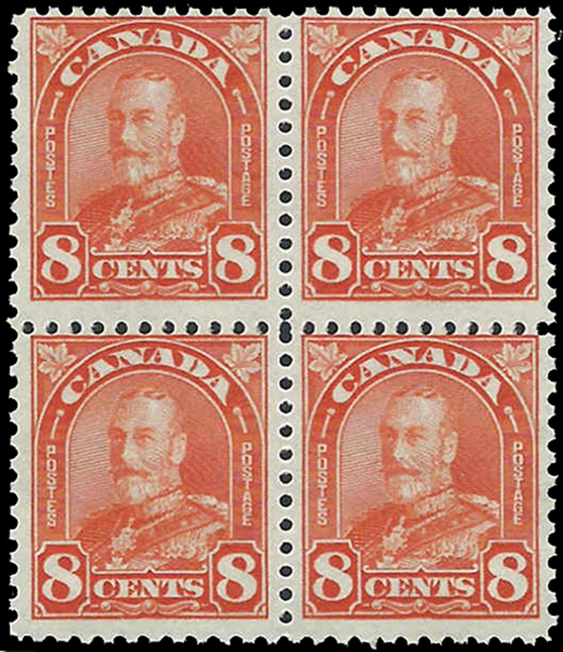 8¢ red orange Arch BLOCK OF FOUR, og, nh, fine. (Image)