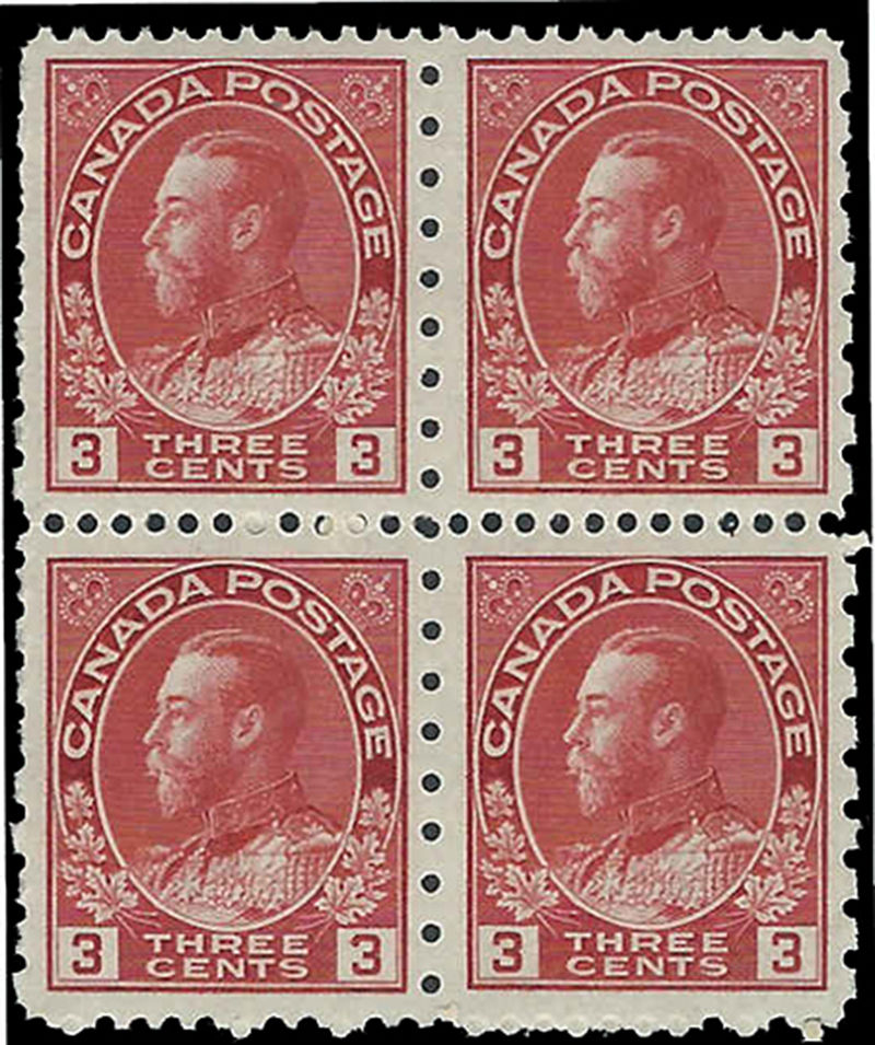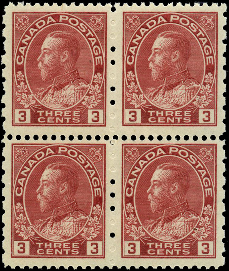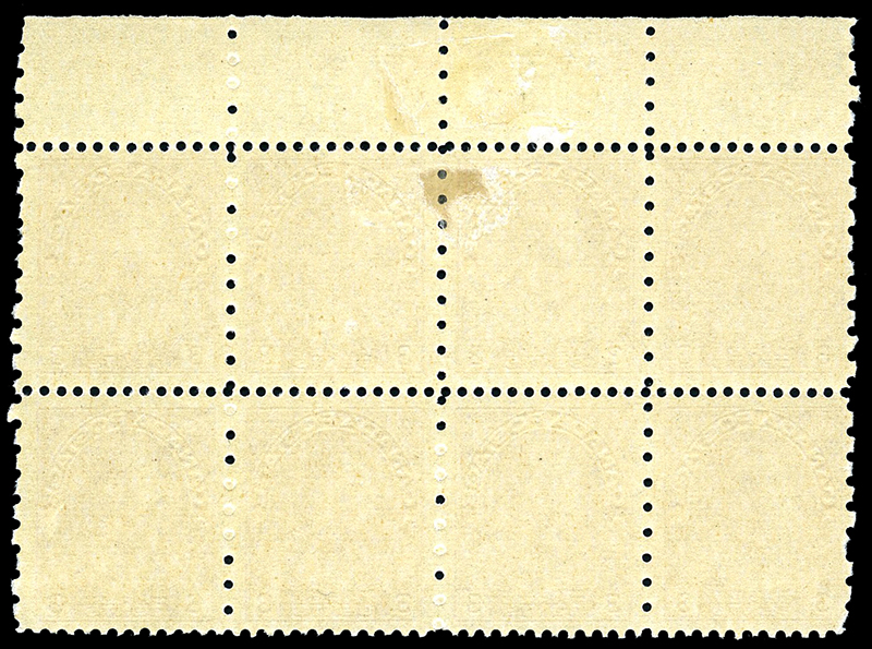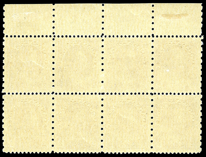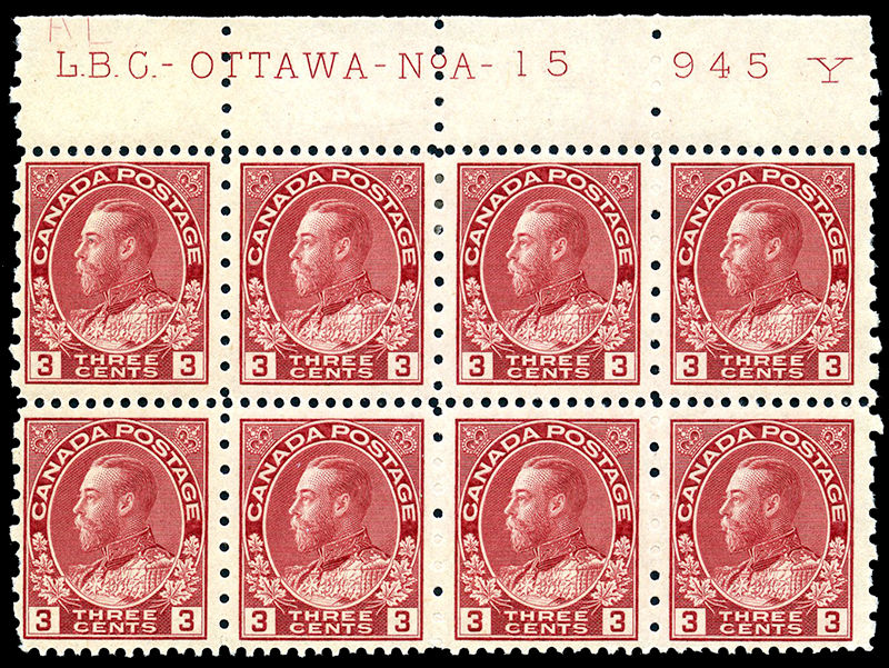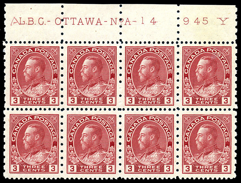 3¢ carmine perf 12x8 top margin AL.B.C.-OTTAWA-No-A 14 (PO) 945 Y block of 8, lh, very fine (Image) (imagea)