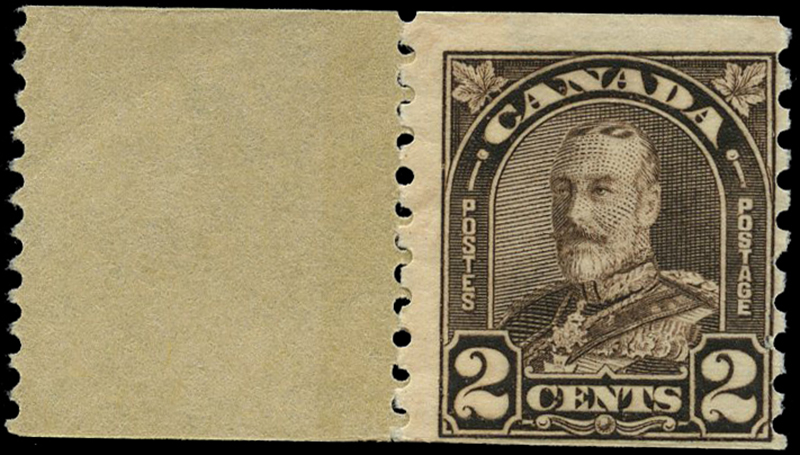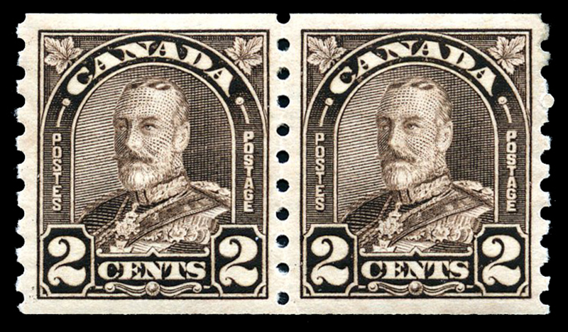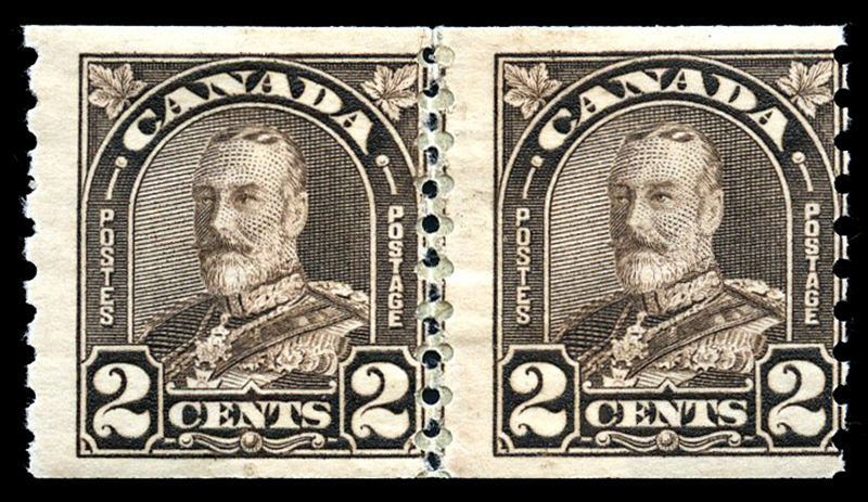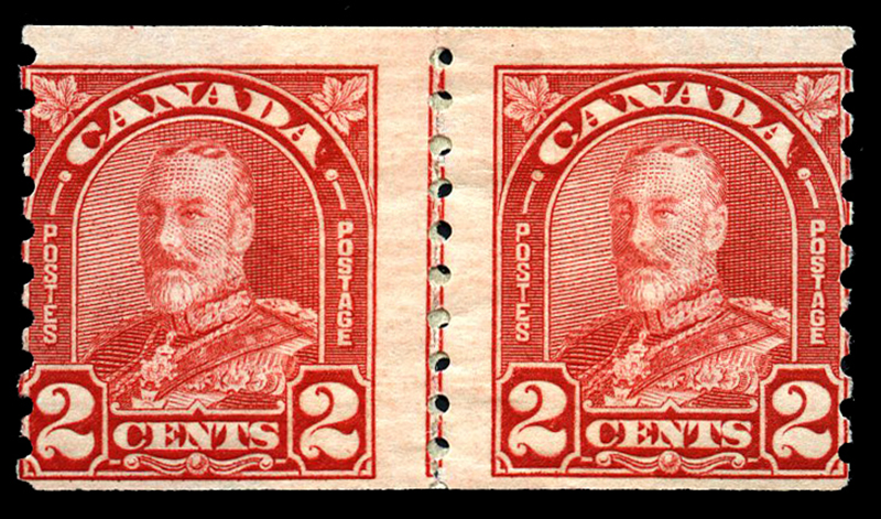 2¢ Arch deep red coil, PASTE-UP REPAIR PAIR, usual centering, nh (Image)