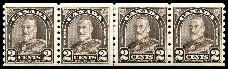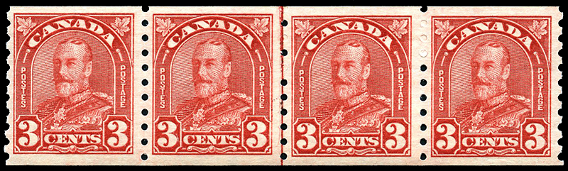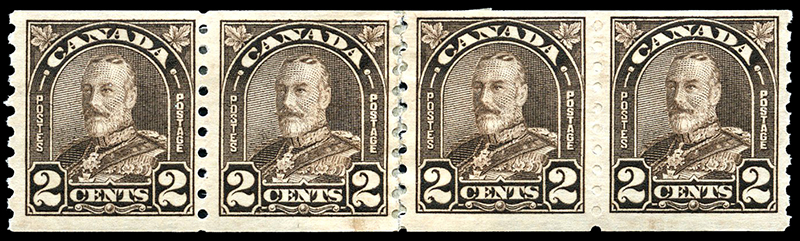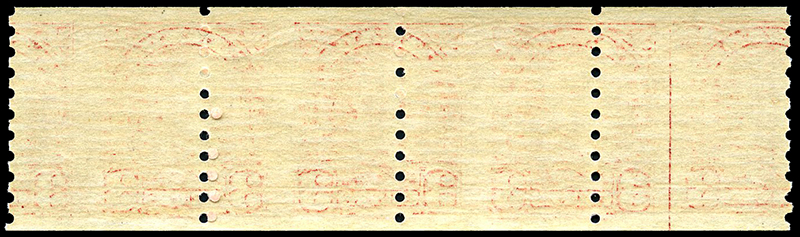 2¢ Arch deep red coil LINE STRIP OF FOUR, nh, very fine (Image)