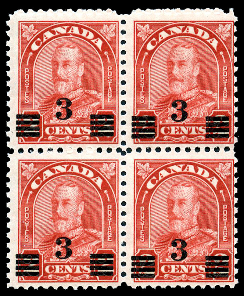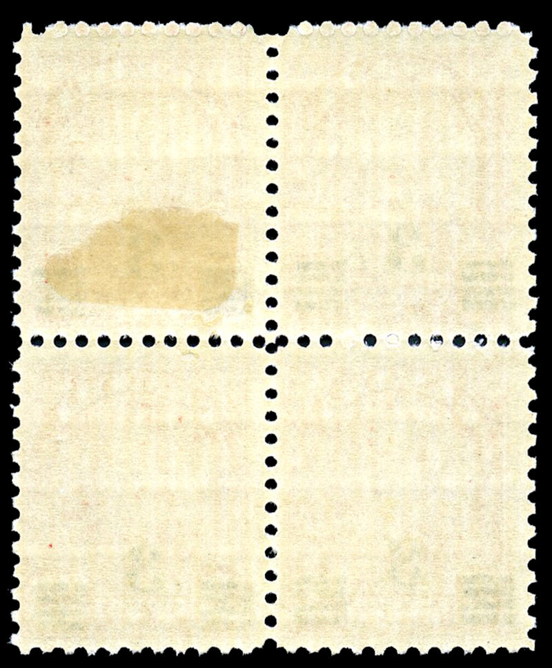 3¢ on 2¢ deep red, Die II, block of four with EXTENDED MOUSTACHE, variety nh, fine (Image) (imagea)
