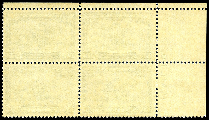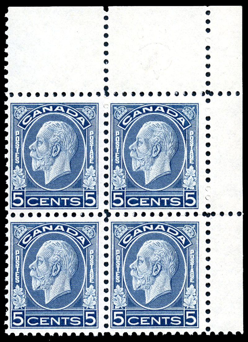 5¢ dark blue, UL corner block of four with MAJOR RE-ENTRY (pos 10), top two lh, bottom two nh, almost very fine (Image)