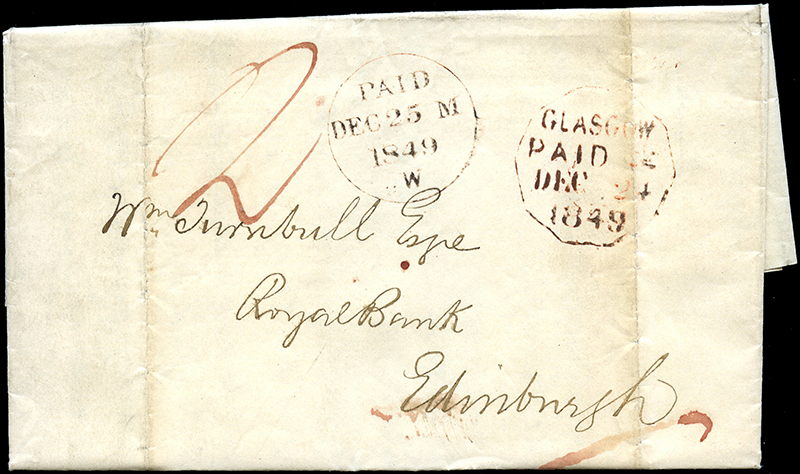 1849 Folded letter with oxidized red decagon GLASCOW PAID DEC 24 1894 to Royal Bank Edinburgh with PAID DEC 25 M 1849 W cancel, filing folds, fine.