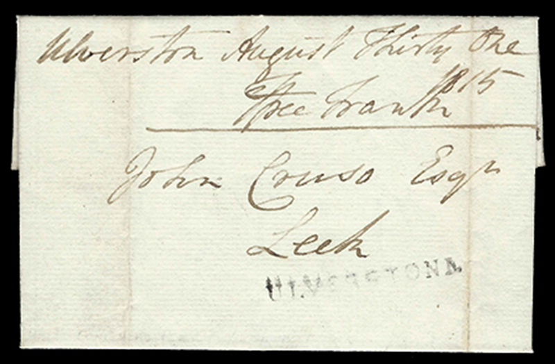 1815 Folded letter dated 31 August 1815 (manuscript despatch date) to Leek, with very fine strike of ULVERSTONE straight line at bottom, endorsed 'Free Frank' at top and delivered without postal charges, the letter is