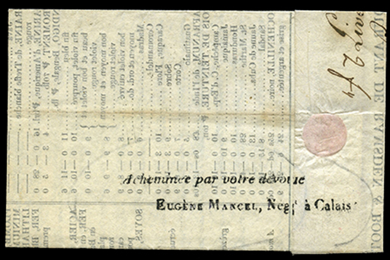 1823 Folded letter and PRICES CURRENT from Liverpool 1 May 1823 to Avignon, carried privately to Calais and placed in the mails there by FORWARDING AGENT Eugene Mancel, Neg. a Calais with very fine strike of their straight