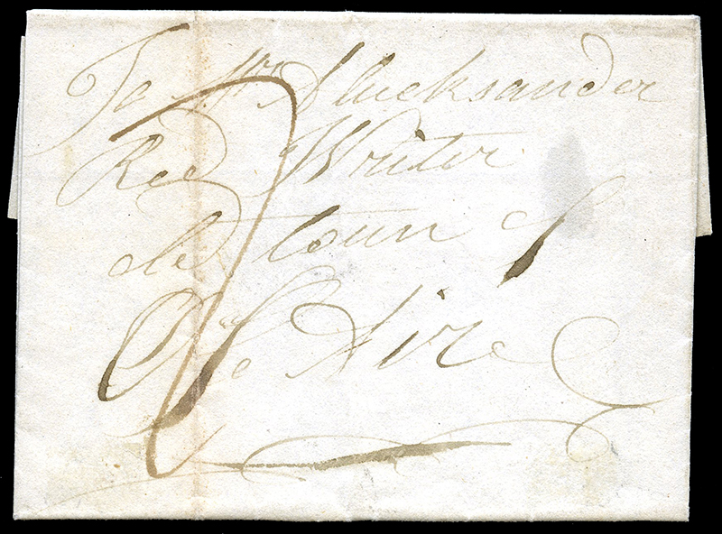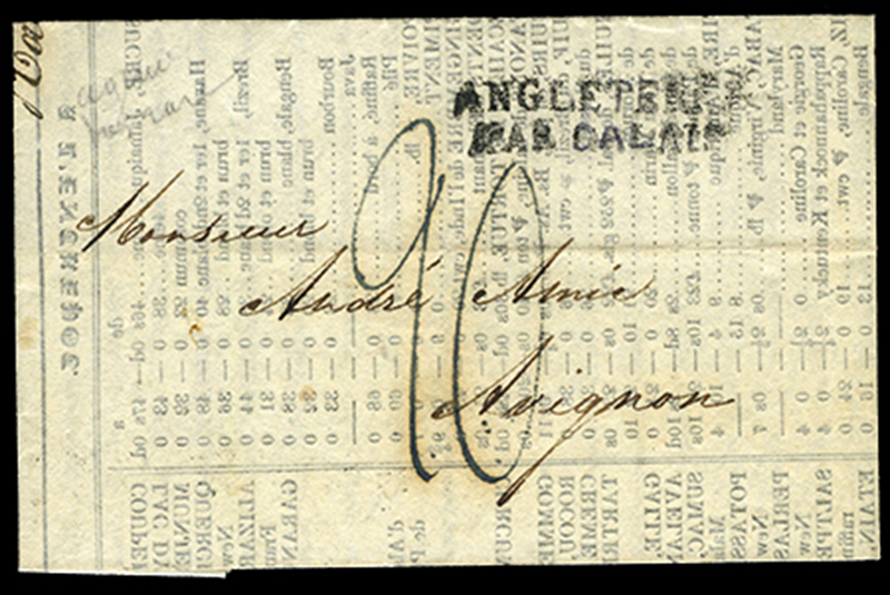 line handstamp on back, marked manuscript 10 (decimes due) and straight line ‘ANGLETERRE PAR CALAIS’ on front, clean and very fine. (Image) (imagea)