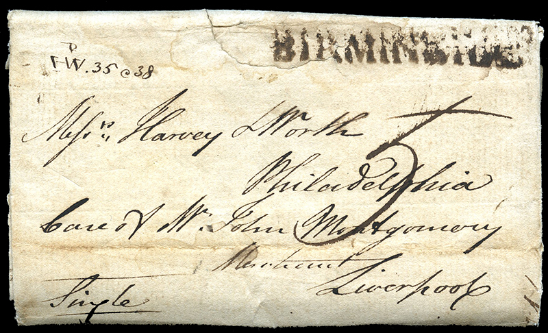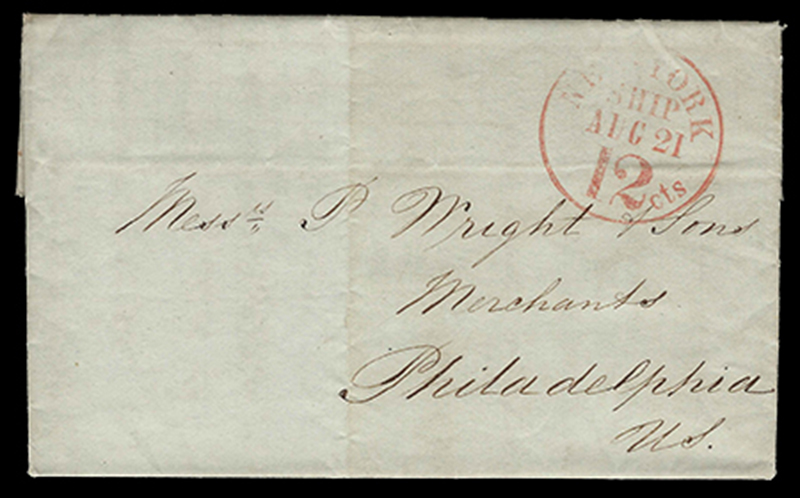 1846 folded DOUBLE RATE Trans-Atlantic invoice internally dated Hanley Staffordshire Potteries July 7, 1846 to Philadelphia, with fine strike of red 'NEW YORK SHIP' 21 AUG '12 Cts' rate stamp (2¢ ship letter fee plus 5¢ x 2