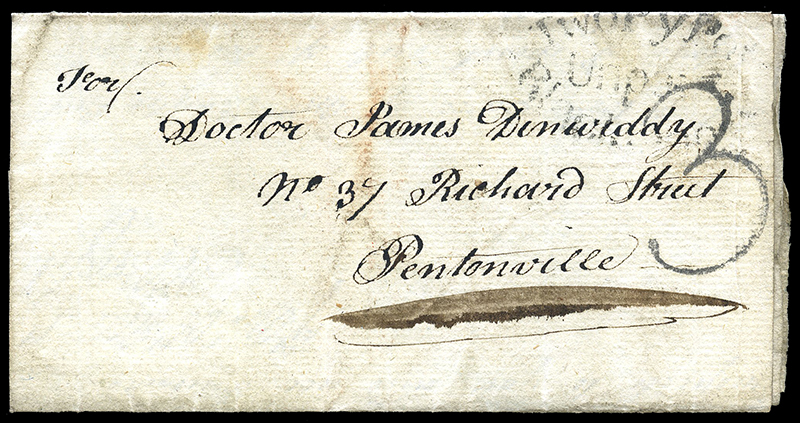 1814 folded letter from NEW INN 6 Sept to Pentonville, fine “Two Py Post Unpaid Blackneath” oval on front, 1814 time and date stamp (Whitney type 29) on reverse, rated 3, filing and trifle soiling, o/w fine (Image) (imagea)