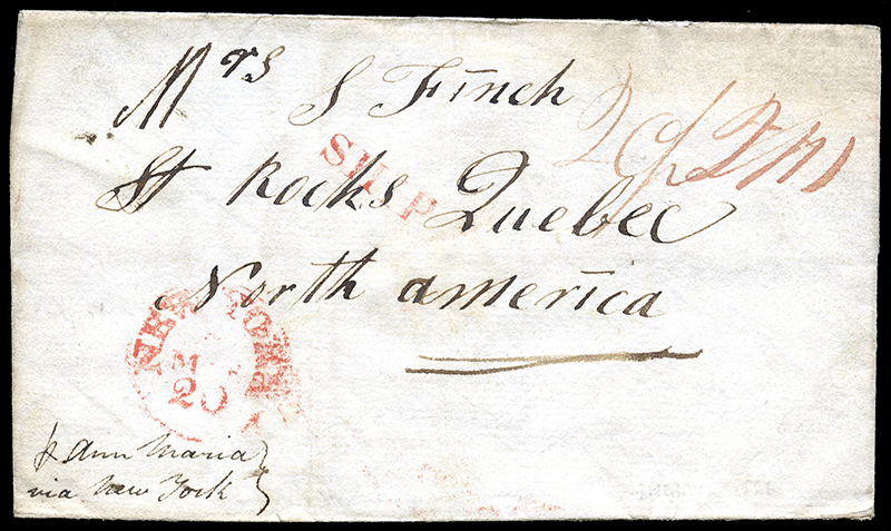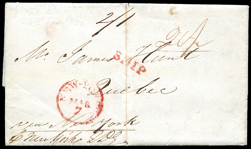 1825 folded TRANSATLANTIC letter from LONDON 22 JAN to Quebec with manuscript via New York, straight line SHIP and NEW-YORK 7 MAR transit all in red, rated (US POSTAGE collect) 20¾ (2d ship letter fee and 18¾ postage to the