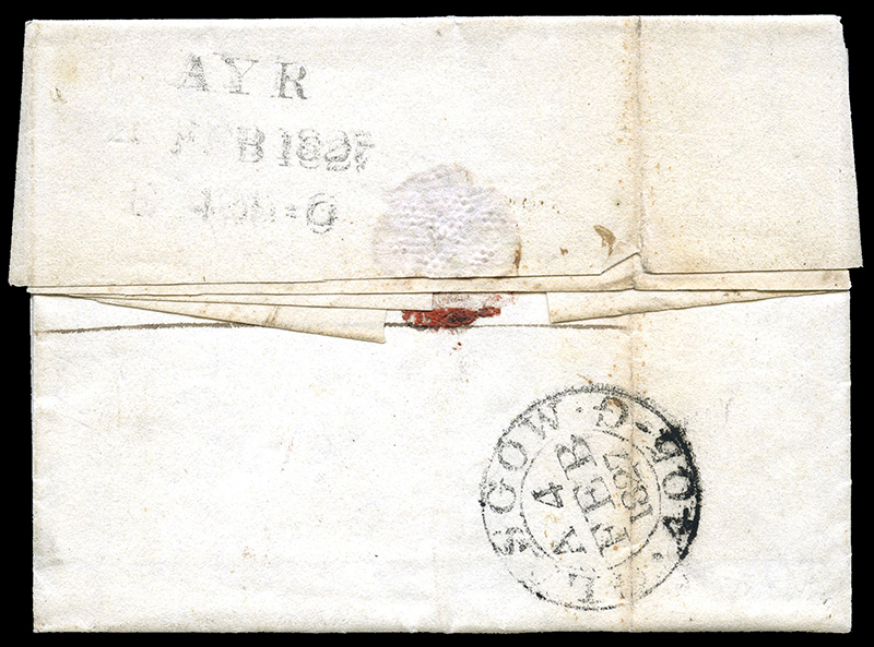 1827 folded letter from GREENOCK, with GLASGOW 4 FEB transit and 3 line AYR 4 FEB ?? straight line arrival on back, very fine. (Image)