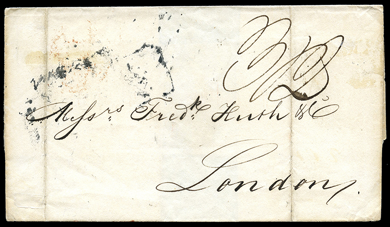 1834 folded cover to F. HUTH & CO in LONDON, oval FORWARDING AGENTS stamp ‘MEYER & HUDSDEN NY’ and originally with manuscript FORWARDING AGENTS ‘KLAUCKE & MAHN’, VERA CRUZ, boxed LIVERPOOL SHIP LETTER,