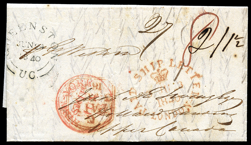 1840 choice folded letter from London, 3 JUNE with red oval “PAID SHIP LETTER” same date via NEW YORK and QUEENSTON U.C., 24 JUN to HOLLAND LANDING U.C., with various rates, very fine (Image)