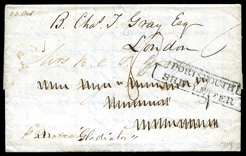 1840 Folded letter internally dated 10 Aug to New York (USA), ms 'per Quebec', rated ms 6d collect, (all crossed out) and re addressed to London, ms 'Gladiator', and stepped boxed PORTSMOUTH SHIP LETTER handstamp, red