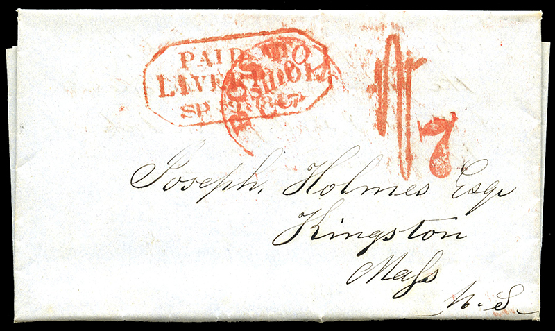 1847 Folded letter, red boxed octagonal PAID AT LIVERPOOL 9 SP 1847 handstamp, rated red 1/ ms and '7' handstamp, to Kingston Mass U.S, red BOSTON transit. fine. (Image)
