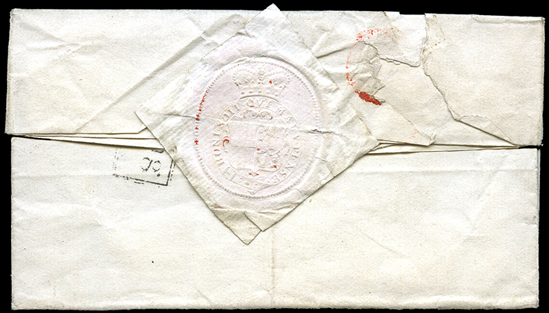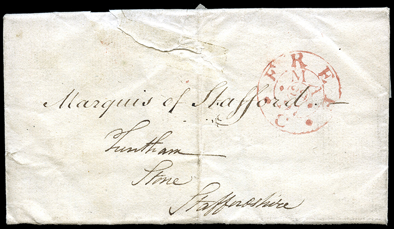 1797: Folded letter written at Salisbury Town, Windsor Castle 28 May, with intact wax Garter Seal, addressed to the Marquis of Stafford, posted at CHARING CROSS 29 MY with fine strike of large red double circle FREE, letter