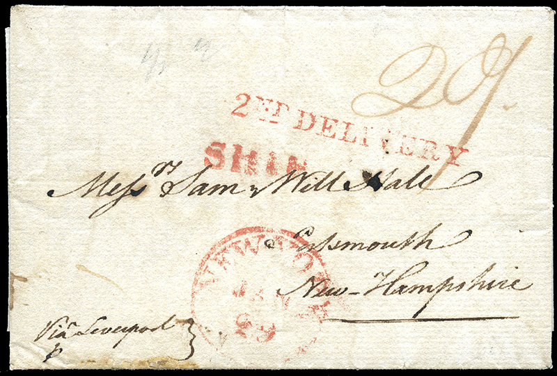 1823 Folded letter, sent privately to Liverpool, red 2ND DELIVERY and SHIP hand stamps, red NEW YORK 29 JAN transit. (Image)