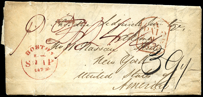 1838 Folded transatlantic letter, BRIGHTON 6 AU 1838 on reverse, rated ms 2/2 and changed to 4/4 prepaid, just missing Falmouth packet and sent by US sailing packet to Boston, red BOSTON SHIP OCT 25 hand stamp, ms rated 39½¢